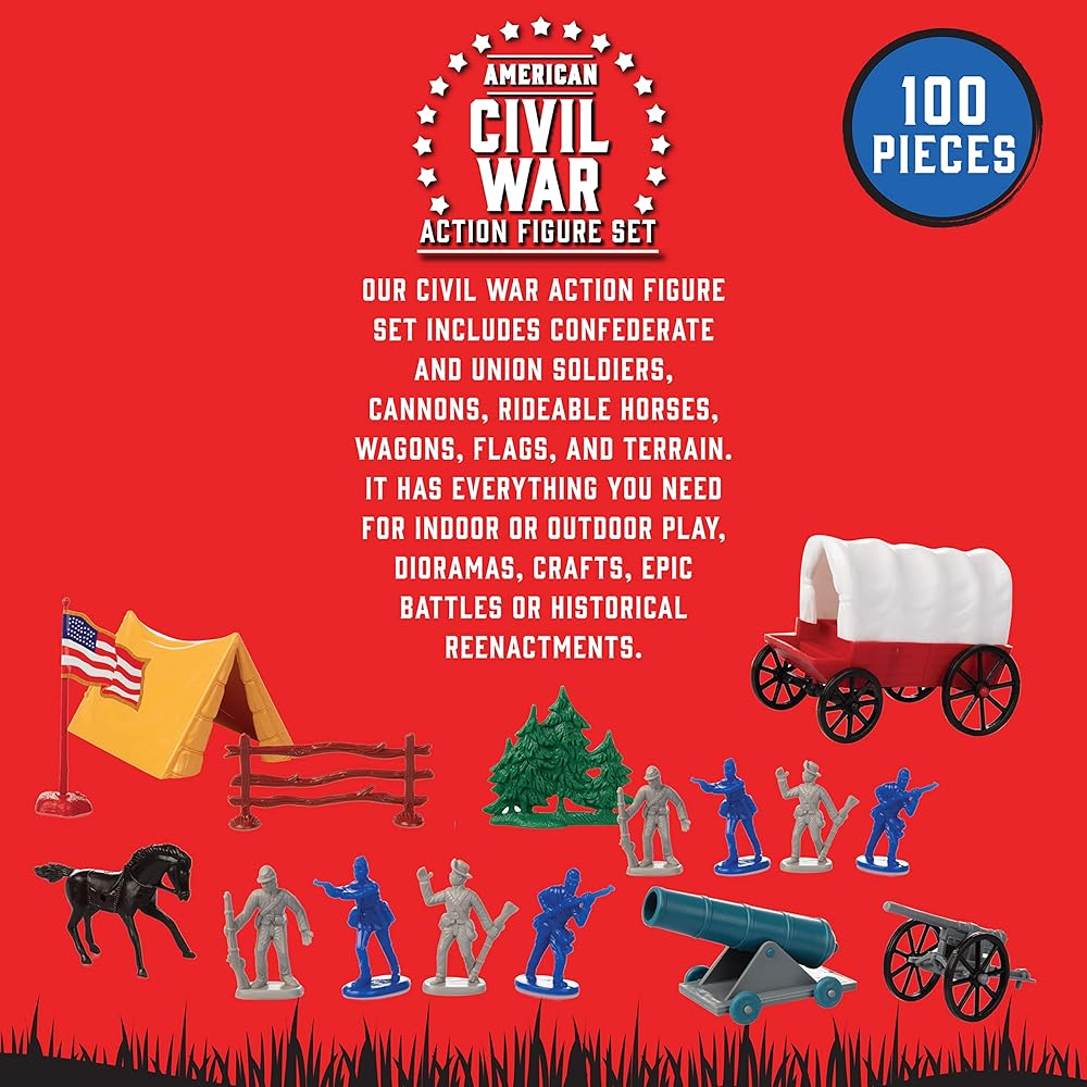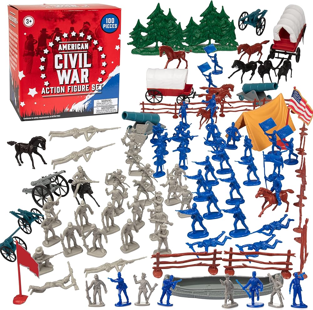 Civil War Army Men Toy Soldier Action Figures - 100+ Pieces, 24 Unique Sculpts - Includes Soldiers, Horses, Cannons, Terrain and More: Bring home this incredible assortment of toy action figures from the Civil War. With over 100 pieces in all, and 24 unique sculpts, this set is perfect for class projects, dioramas, history lessons, or other educational activities! Includes a convenient carrying case to make sure all your toy soldiers stay in one place! Recreate history with this fantastic set