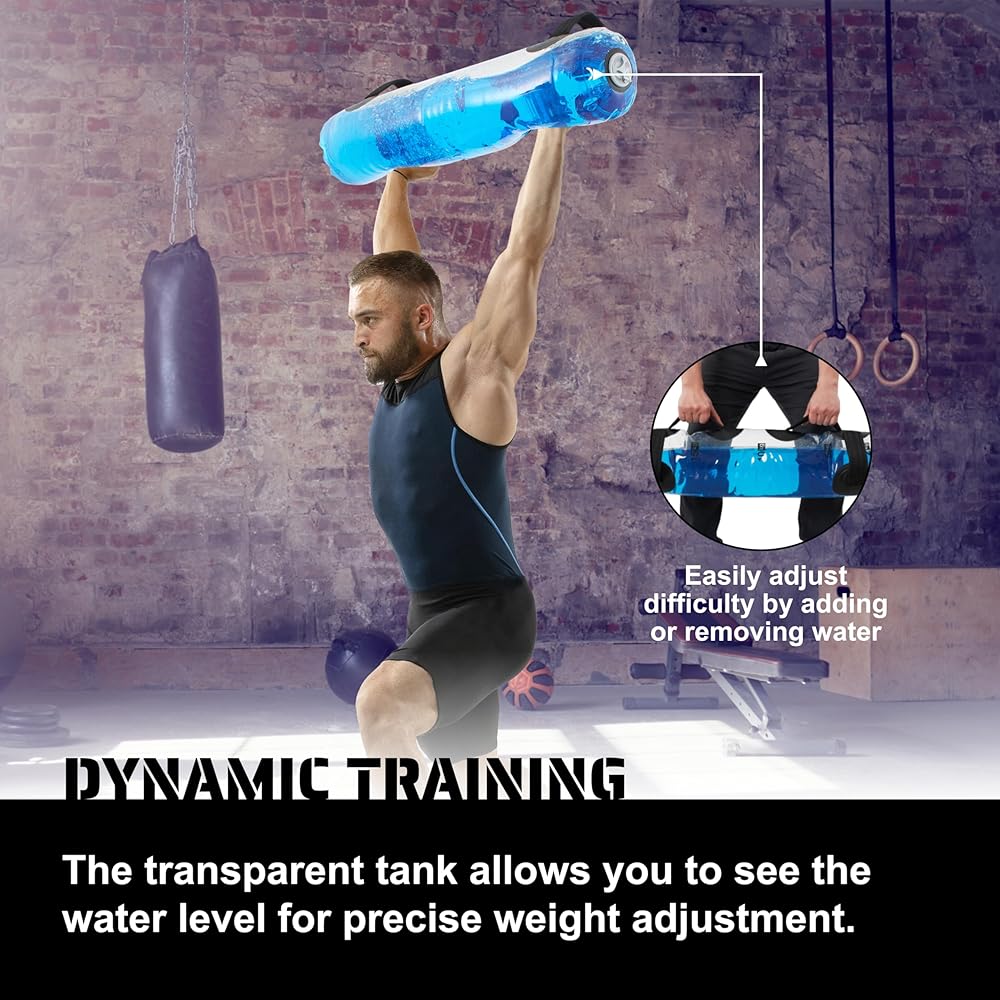 ENHANCED CORE STRENGTH AND BALANCE: The water bag weights, measuring 8Hx28.7Lx8W Inch, offer an unstable nature that effectively engages the core muscles, improving core strength, balance, and overall stability