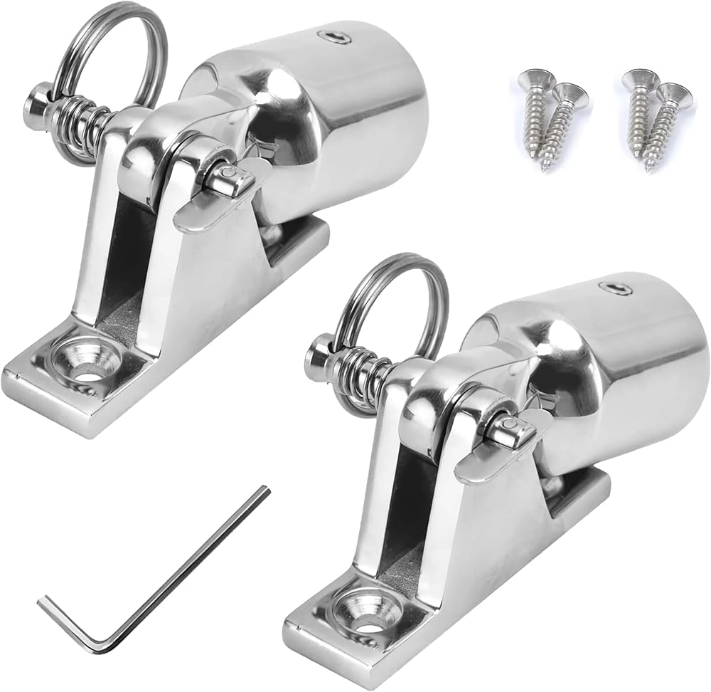 【Package Contents】This set includes 4 PCS of bimini top parts: 2 eye end caps, 2 deck hinges with quick-release pins, installation screws, and 1 L-shaped hex key for convenient assembly.