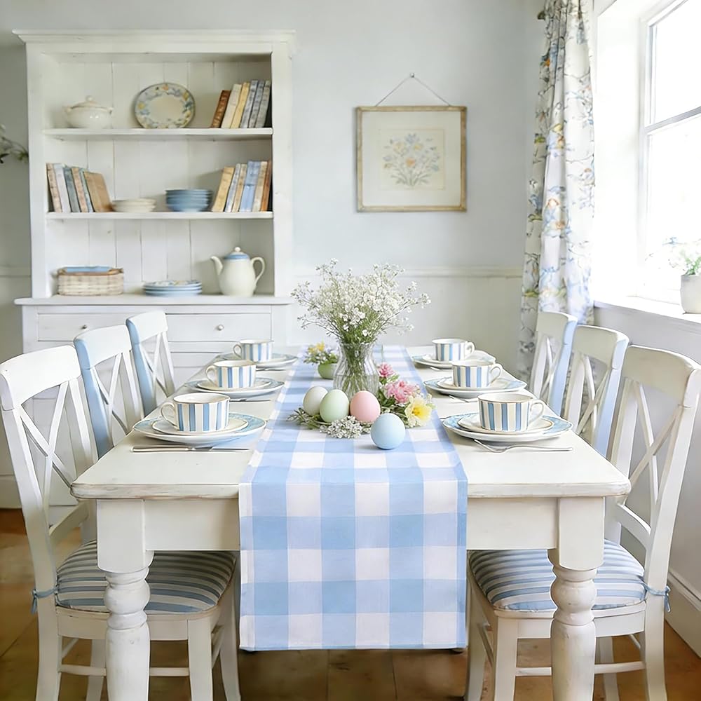 yuboo Light Blue Gingham Table Runner 72 inches Long, Spring Easter Blue and White Buffalo Plaid Check Table Cloth Party Suppliers for Farmhouse Rustic Birthday Wedding Party Table Decorations