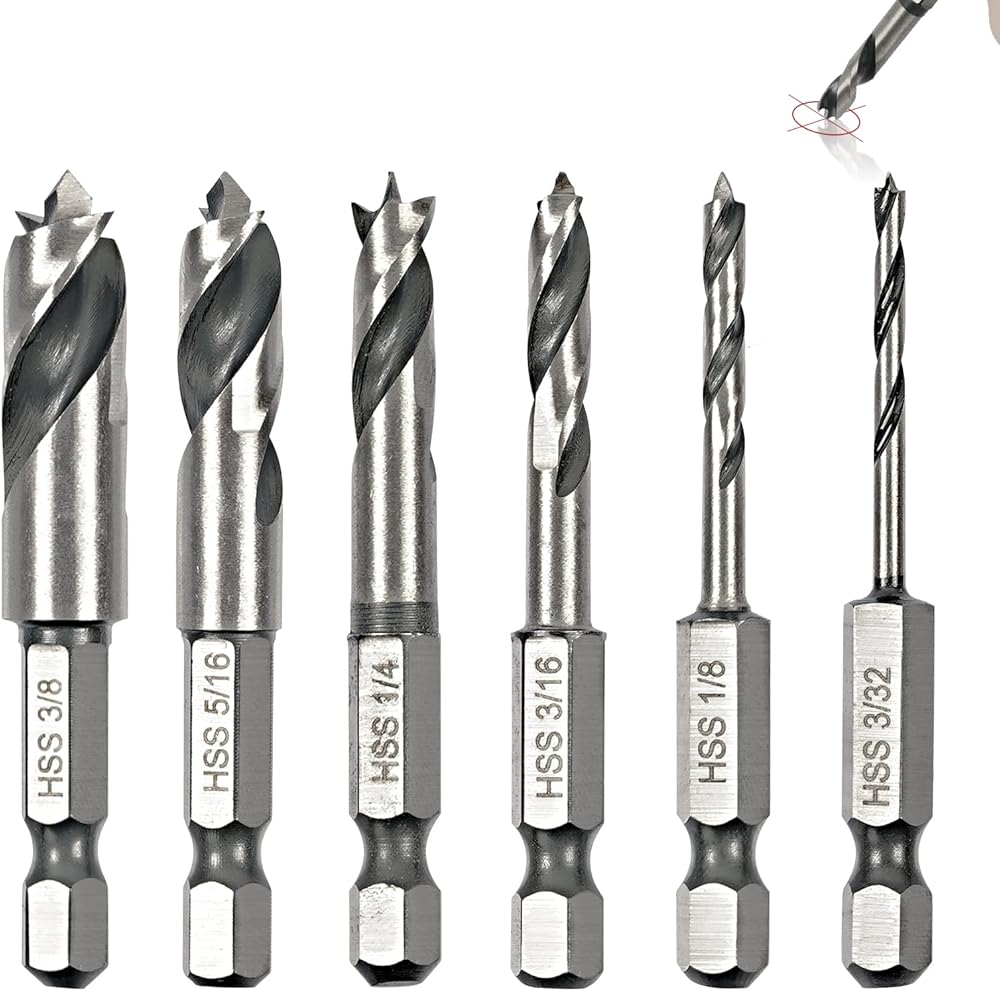 Sweetone 6 Pcs Brad Point Drill Bit Set1/4" Quick Change Hex Shank, HSS 4241 High Speed Steel Stubby Drill Bit Set for Metal/Aluminum Iron/Sheet Copper/Wood Woodworking