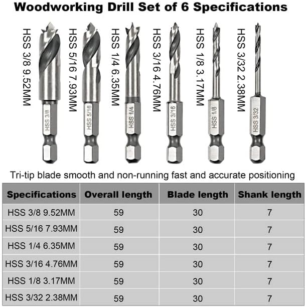 【6Pcs Stubby Brad Point Short Drill Bits】The 6 pieces wood twist small drill bit set, sizes: 3/8"(9.52mm), 5/16"(7.93mm), 1/4(6.35mm), 3/16(4.76mm), 1/8(3.17mm), 3/32(2.38mm). Total length: 70mm.
