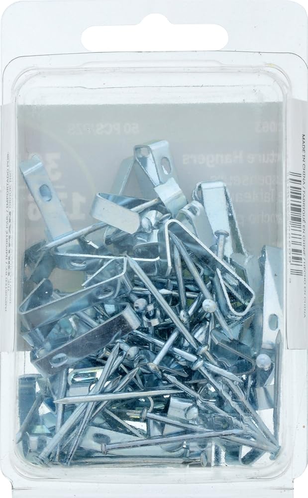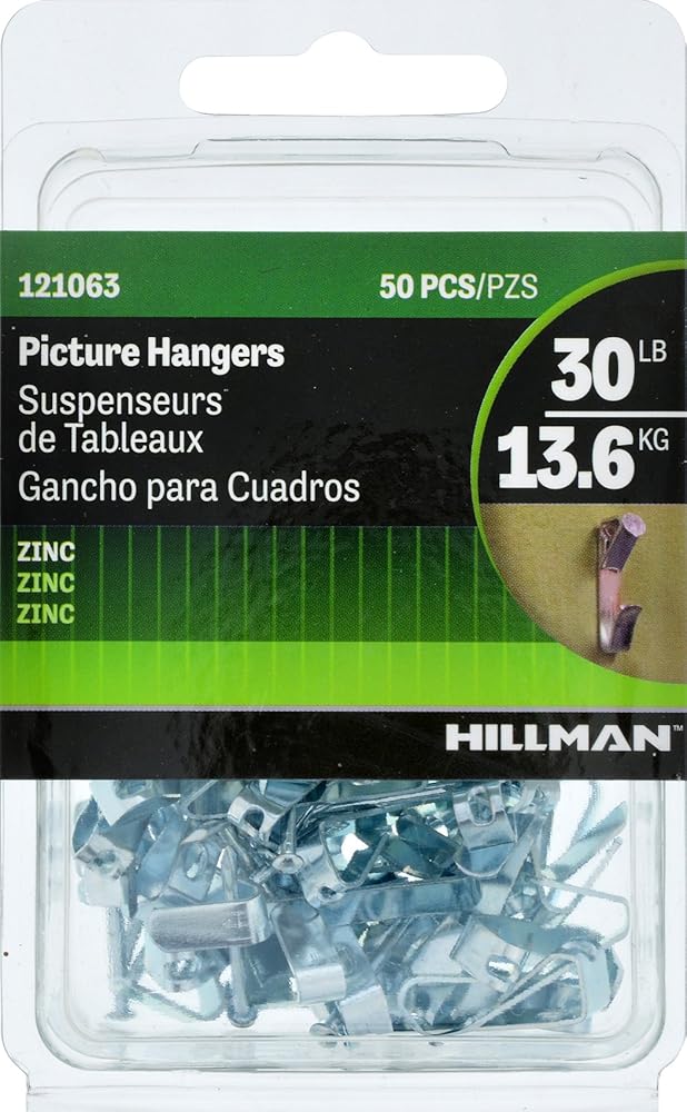 Hillman Picture Hangers are uniquely designed for easy installation. Available in your choice of finish; brass, white, or zinc. Ideal for drywall and plaster surfaces. These hangers are reusable and are designed to eliminate wall damage. Available in weight ratings of 5lb, 10lb, 20lb, 30lb, 50lb and 100 lb. Hanging tip- always use a stud when using the Hillman Conventional Picture Hanger. Materials needed: Stud finder and hammer