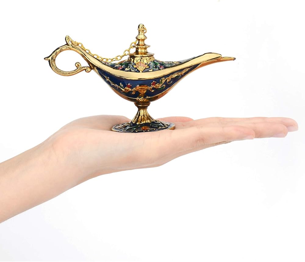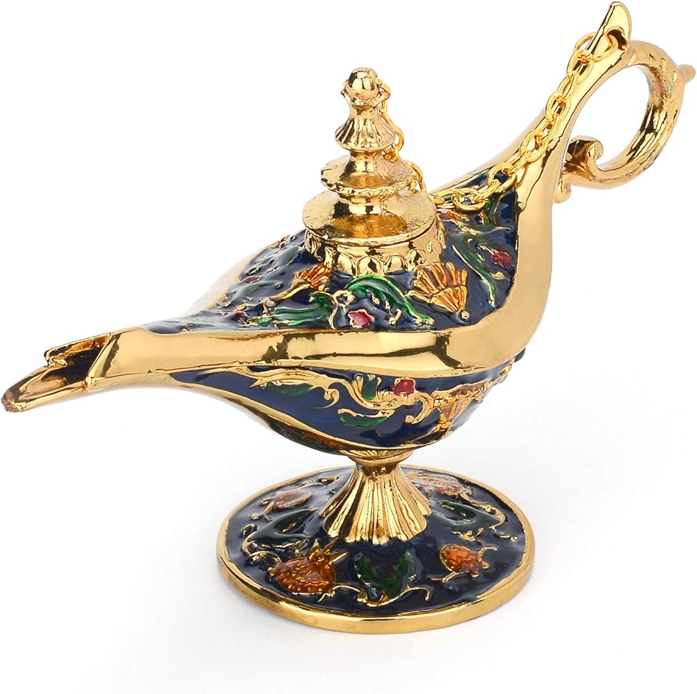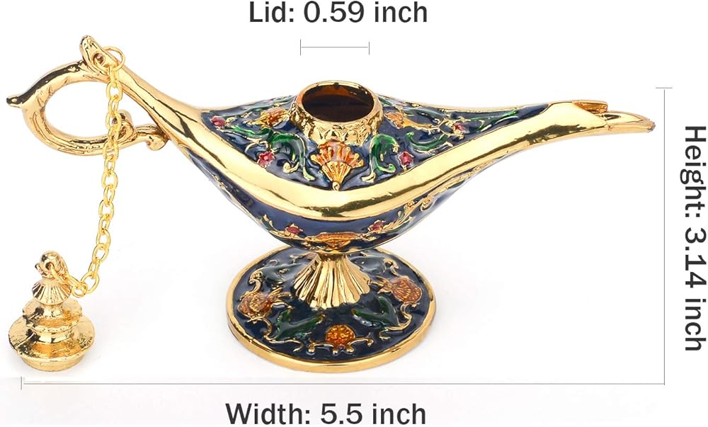 Magic Genie Wishing Lamp Trinket Box Exquisite Design 1.Magic Genie Lamp Ornaments was made by wonderful and stunning craftsmanship,display mystery and legend. 2.Hand painted with beautiful colors and luxurious palace floral painting design,showing noble and delicate. Versatility Application 1.Genie lamp is the perfect favor for Gift,Ornaments,Collection,Home Decor. 2.Magic Genie Lamp Trinkets bring a smile to someone who receives one,Wish all wishes come true. Vabulous for Gifting 1.Wishing lamp is a great gift for someone who likes lamp story,unique collection addition!and make you makeup table or shelf more lively and conspicuous. 2.The Perfect Birthday Festival Daily Life Gift Trinket Boxes. 3.Gift idea for Graduate,Birthday, Easter,Mother's Day,Father's Day,Thanksgiving Day,Valentine's Day,Christmas,Theme Party Decoration,Housewarming. Service If you anything with lamp trinkets,please contact us,we will try our best to help you. Notice 1.Vintage Genie Lamp crafts is Not Function oil Lamp,Collection Decor Only. 2.Please pay attention to the size before buying,Magic Wishing Lamp size is Width:14cm/Height:8cm/Weight:201g.
