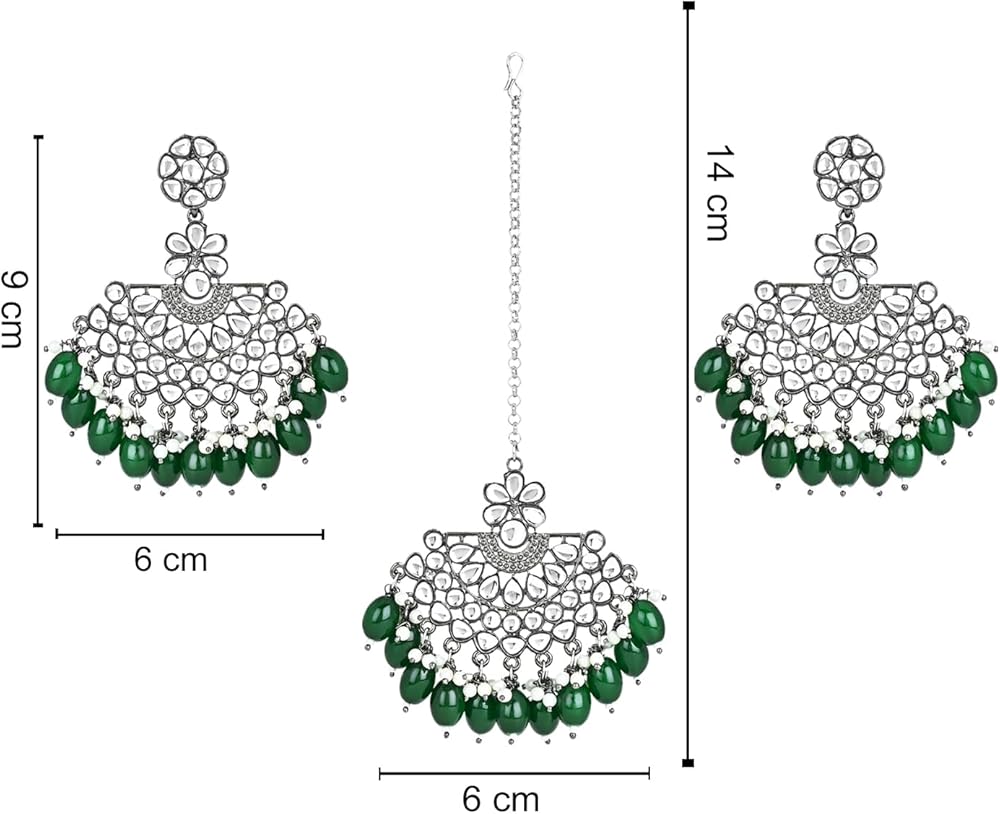 DIMENSION: Earring Height - 9 cm x Width - 6 cm, Maang Tikka Height - 14 cm x Width - 6 cm. The silver oxidised chandbali earrings with maang tikka set is a fashionable jewelry set designed for women and girls, especially suited for the festive occasion of Navratri. This set features elegant silver oxidized chandbali earrings adorned with kundan and pearl embellishments, showcasing a blend of traditional and modern designs. Additionally, it includes a coordinating maang tikka, adding a traditional touch to complete the ensemble. Perfect for adding a touch of grace and ethnicity to Navratri celebrations and other special occasions.
