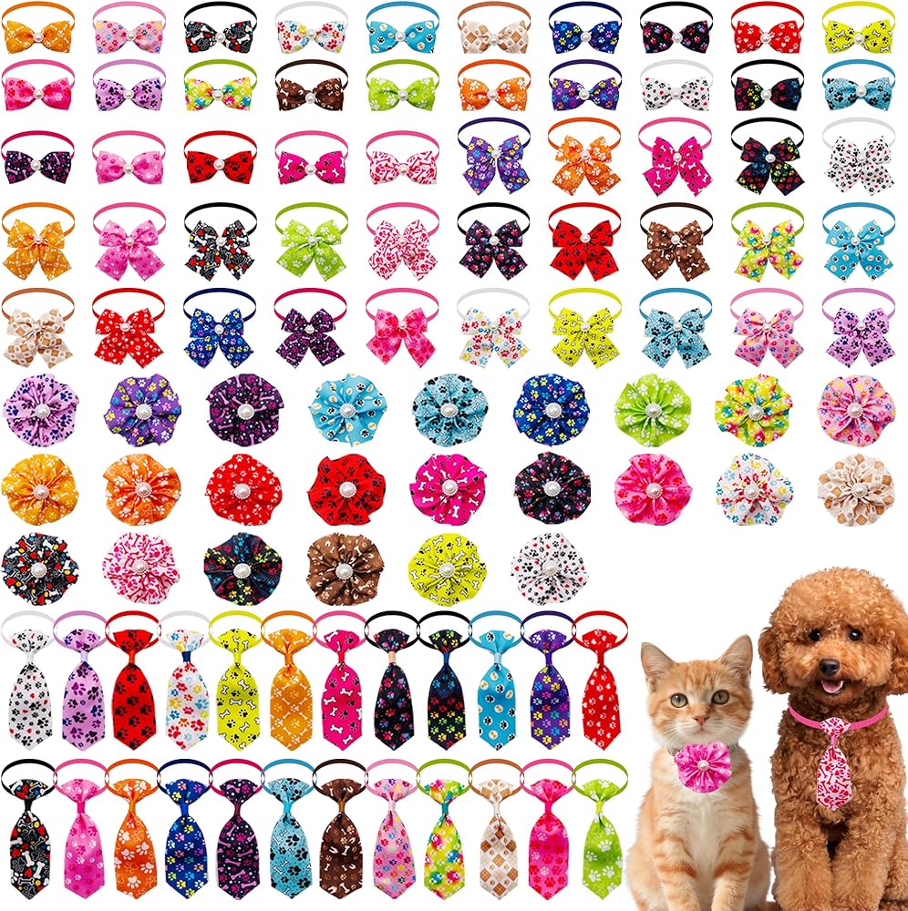 Adequate Quantity and Style: There are 25pcs/pack adjustable pet collar bow ties, 25pcs adjustable pet collar bowknot, 25pcs adjustable pet neckties and 25pcs pet collar flower attachment bows. Total 100 pieces for this set.