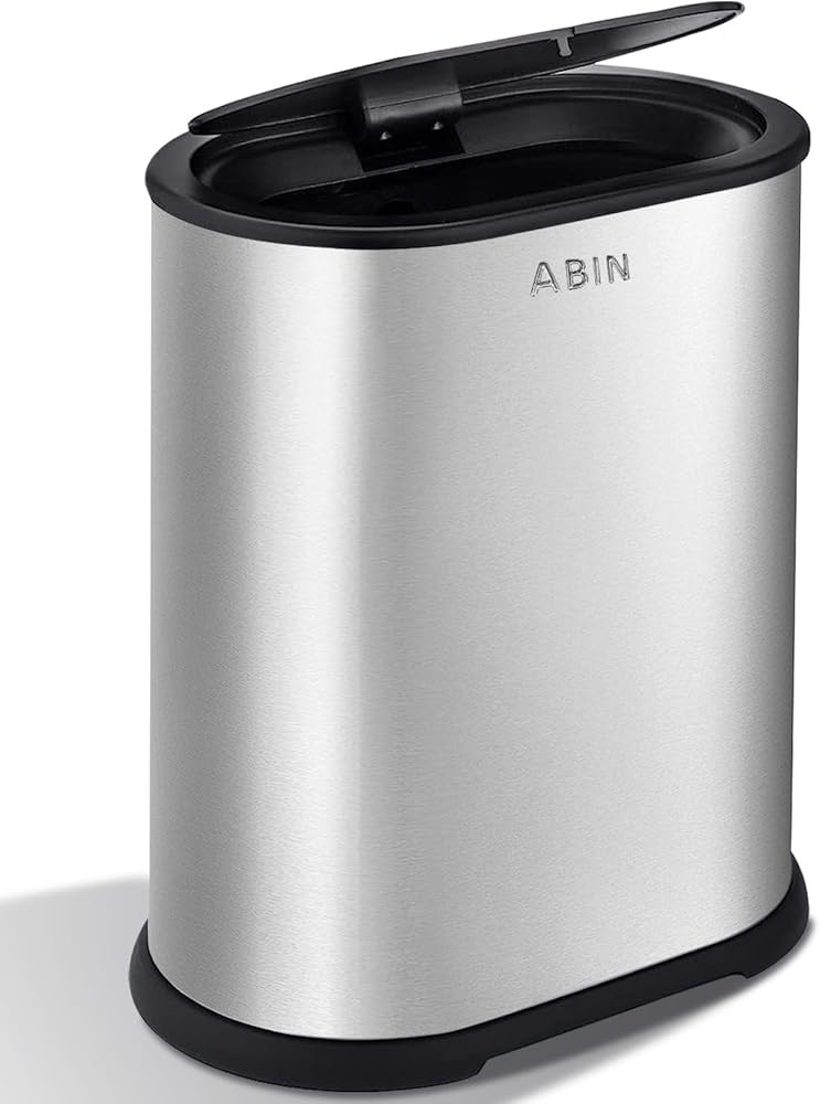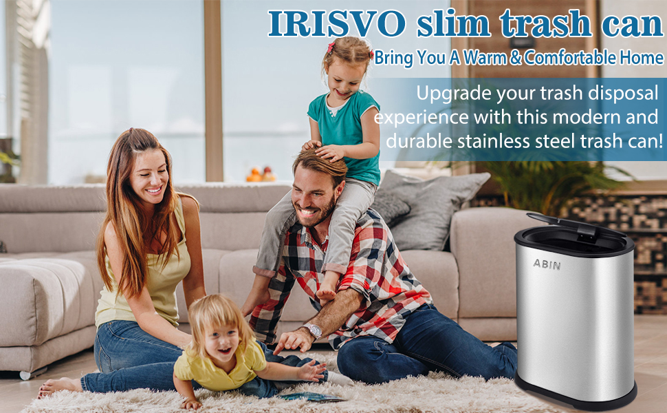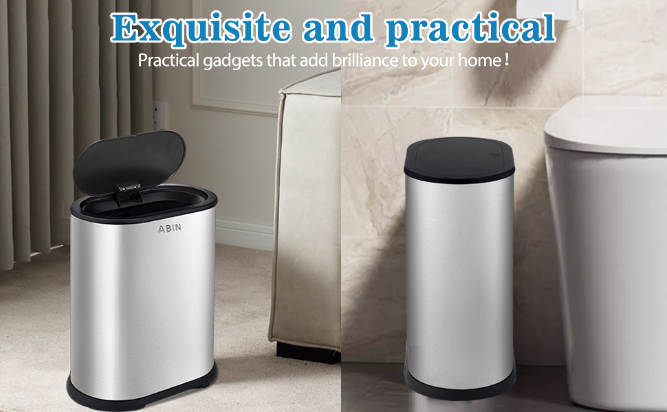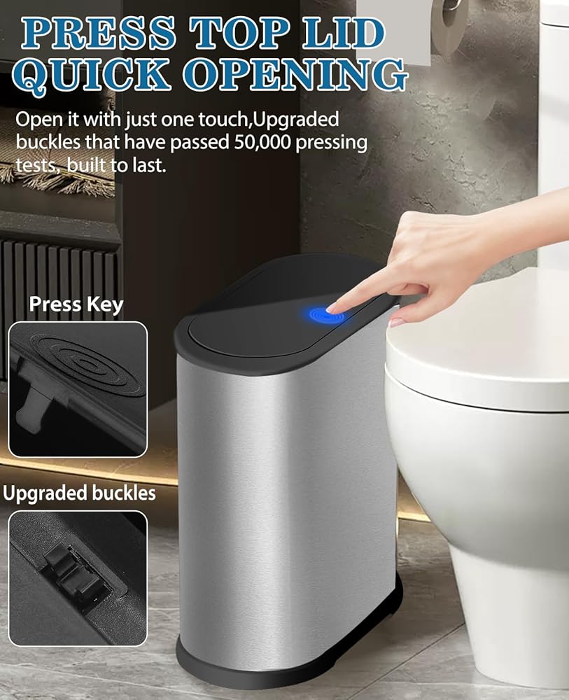 ✅【PREMIUM 410 STAINLESS STEEL Bathroom Trash Can】:Our bathroom trash can made of premium stainless steel + Plastic, the surface is durable and smooth, you can easily remove the dirt, besides, it has strong waterproof and moisture-proof function, no water stains remain on the surface after rinsing, very suitable for bathroom, living room and other rooms