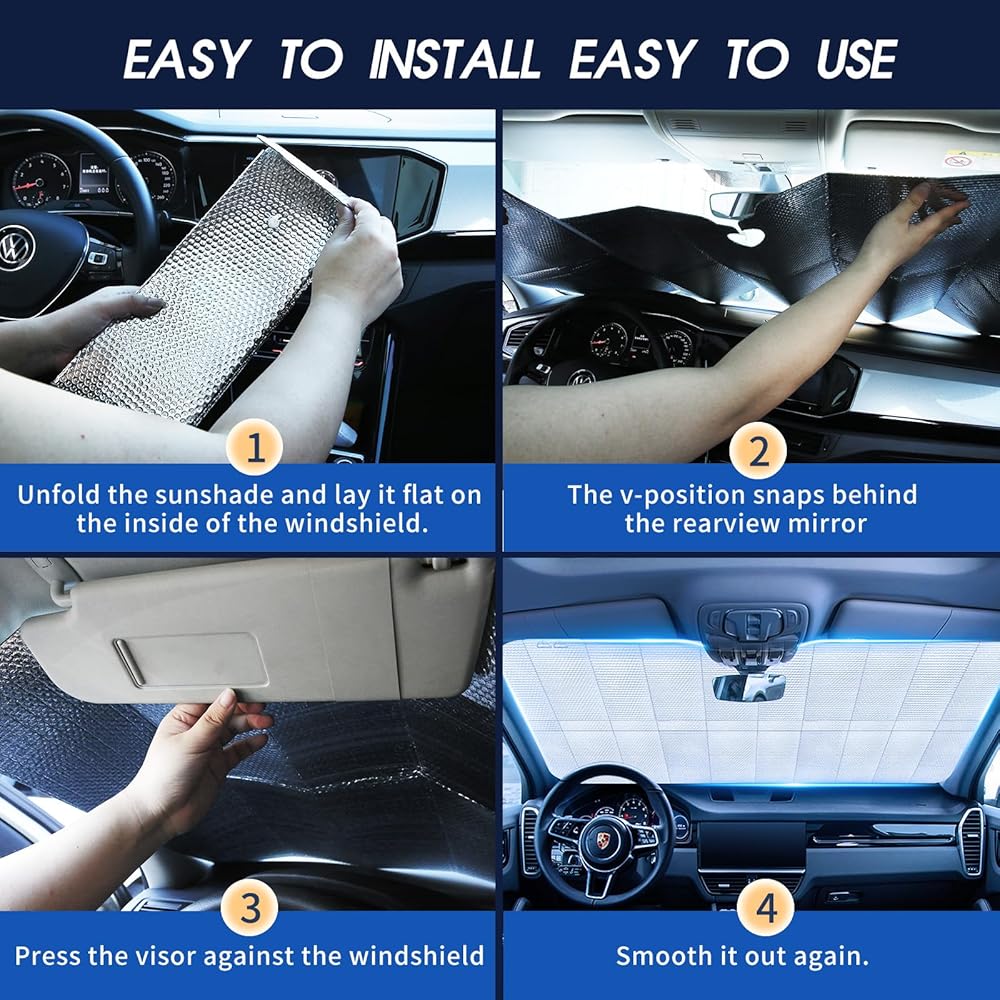 Superior Protection for Your Car Interior: Shield your car from the sun's harsh rays with our top-quality Car Windshield Sun Shade. Designed to protect your vehicle's interior, this sunshade keeps your dashboard, seats, and steering wheel from aging prematurely. It reduces sun and heat exposure, ensuring your car stays cooler and more comfortable. Perfect for car owners and drivers who park outdoors, this sunshade is essential for preserving the look and feel of your car's interior.