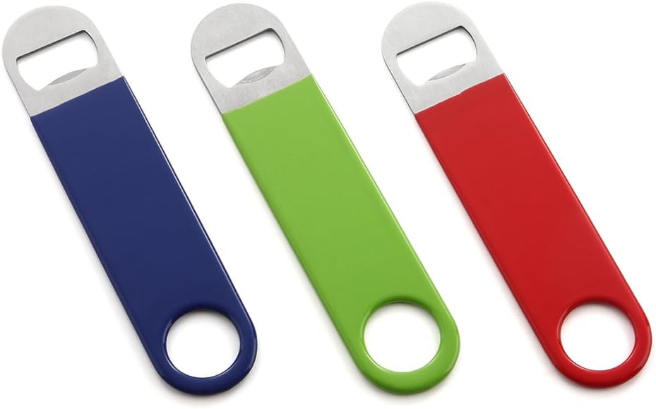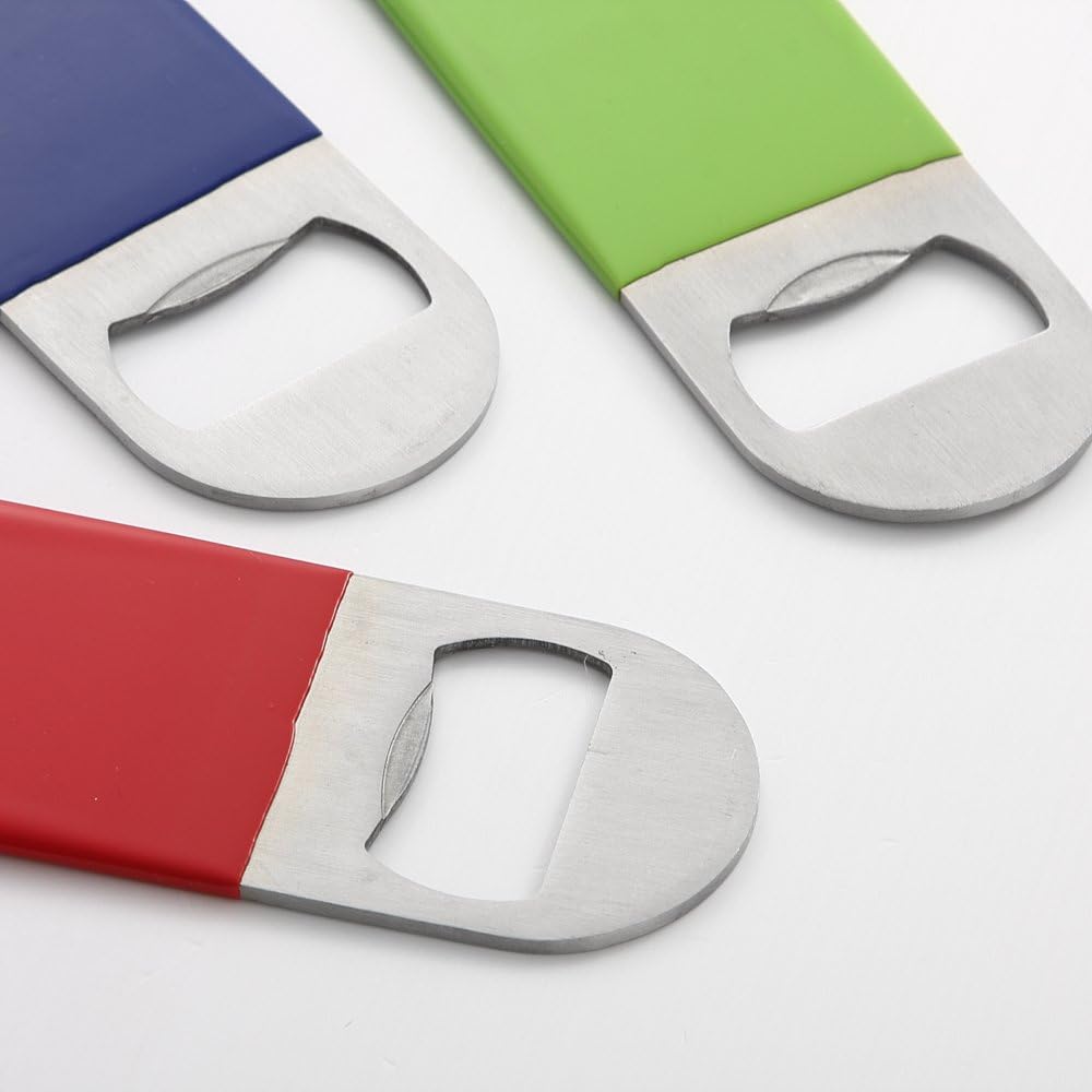 These hand-held flat bottle openers are made of stainless steel, making them durable enough to keep the tops popping off for years to come. This tool is easy to handle and precisely the right tool for the job. Each opening end is a different shape to accommodate various types of bottles.