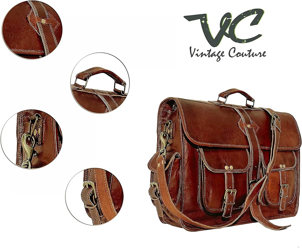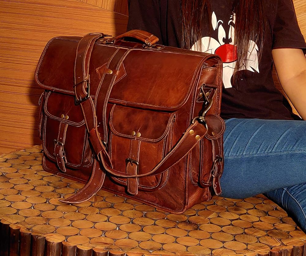 A perfect companion for your college office and other use - Made with Hands Genuine leather messenger bag Going office or collage need something to carry all your essentials like laptop , files , folder and belonging and to keep them at one place our leather laptop bag is perfect for all your needs. Size : 18" Wide 13" High 5" Deep Color : Brown Material : Genuine Leather (Goat Hide) Protection : Laptop padding to keep laptop safe. Unisex leather laptop bag messenger bag satchel in dark brown. product have leather smell but its puerly leather not bad smell when you use it it will be removed