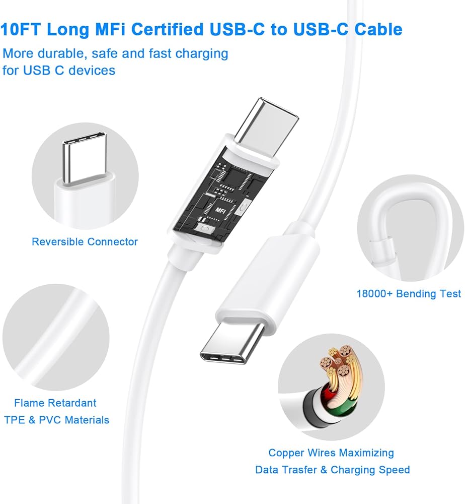 • 【2 Pack 10FT Long iPhone 15 Charger USB C Cable】 2 Pack wamaxlink 10 ft long usb c to usb c fast charging data sync cables equipped with the latest Official Certified Chip, supports 100% High-speed Fast Charging and 480 Mbps data syncing transfer speed, no more trigger warning messages. Tangle-free 10 Feet length is convenient for usage while charging and syncing at home/office/travel in bed, hotel rooms, and more.