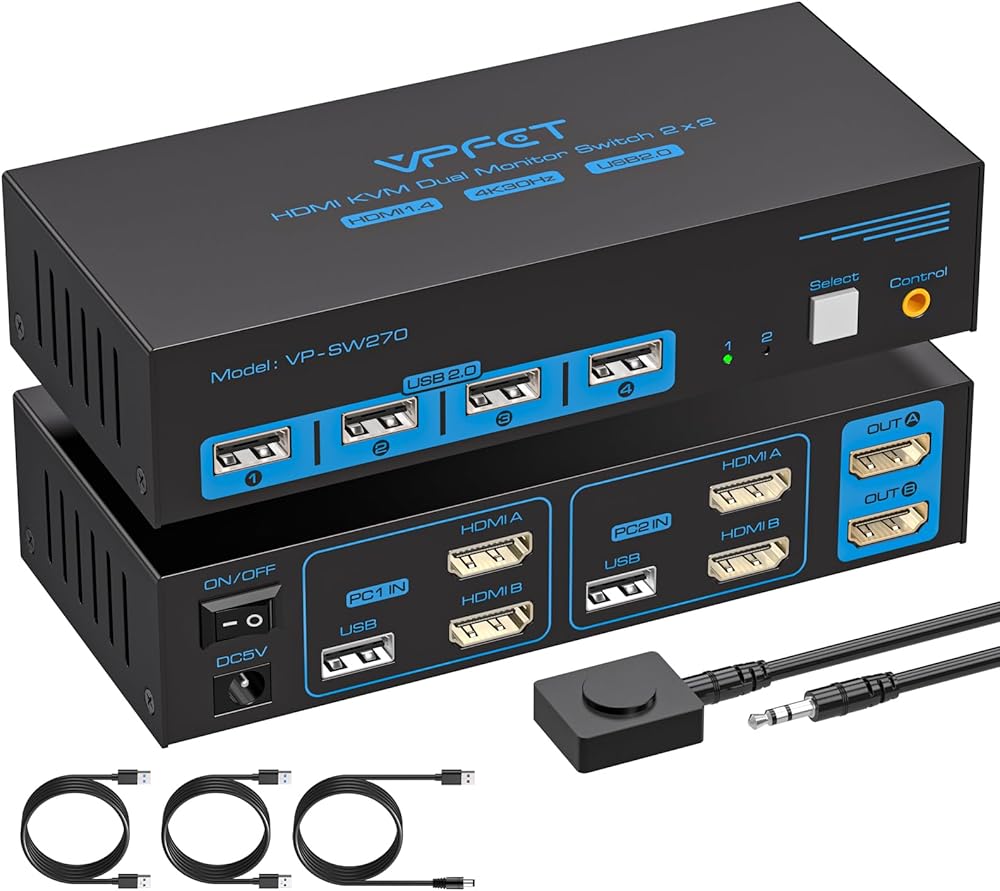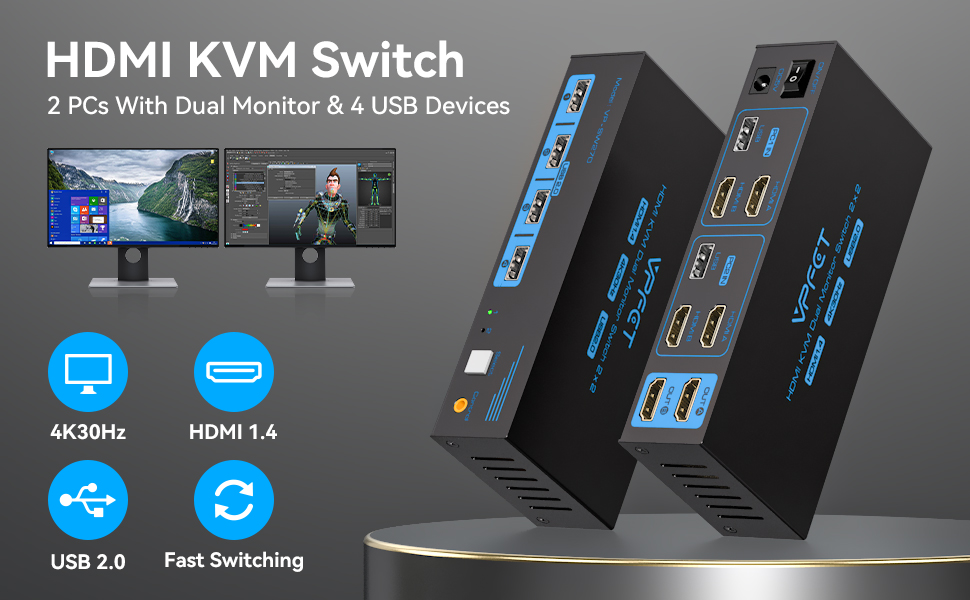 HDMI KVM Switch 2 Monitors 2 Computers 4K@30Hz USB 2.0 KVM Switch Dual Monitor for 2 Computers Share 2 Monitors and 4 USB Devices Support Extended/Copy Mode with 2 USB Cables&Desktop Controller