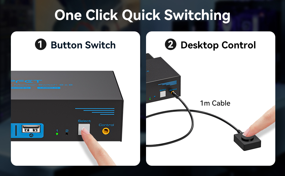 【KVM switch Two Switching Options】The KVM switch HDMI 2 port supports both front panel buttons and desktop controller switching, allowing you to switch between two sources at the touch of a button, and the LED light shows the active device, solving the problem of frequent plugging and unplugging. Desktop controller also allows the cable control to be hidden away for a neater desk surface. NOTE: Keyboard shortcuts (hotkeys) toggles are not supported.