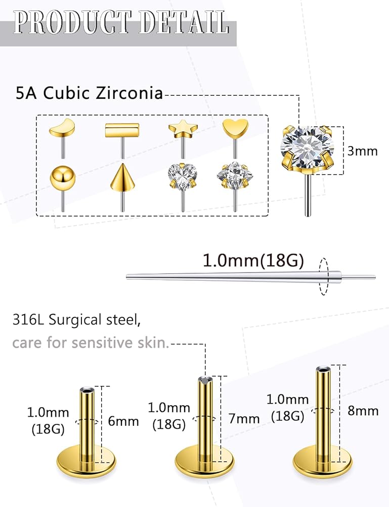 [Size Detail]: Nose Rings Gauge Size: 18G(1.0mm); Tops: 3mm; Wearable Bar Length of Nose Studs: 6mm,7mm,8mm; Color: Silver.