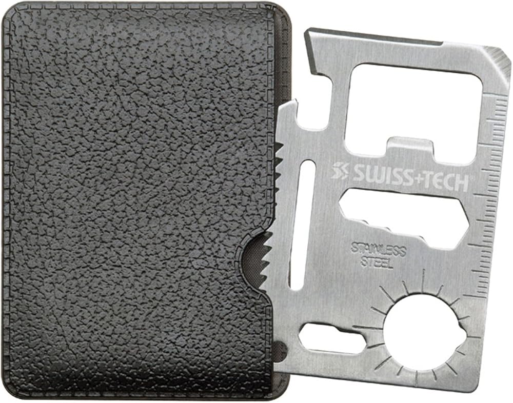 The Swiss+Tech Credit Card Survival Multi-Tool fits easily in your wallet or in a pocket. Comes with a carrying case for protection. Be ready in an emergency! 11-in-1 tool includes: can opener, knife edge, screwdriver, ruler, bottle opener, 4-size wrench, wing nut wrench, saw blade, water compass, 2-size wrench, and lanyard or key ring hole.
