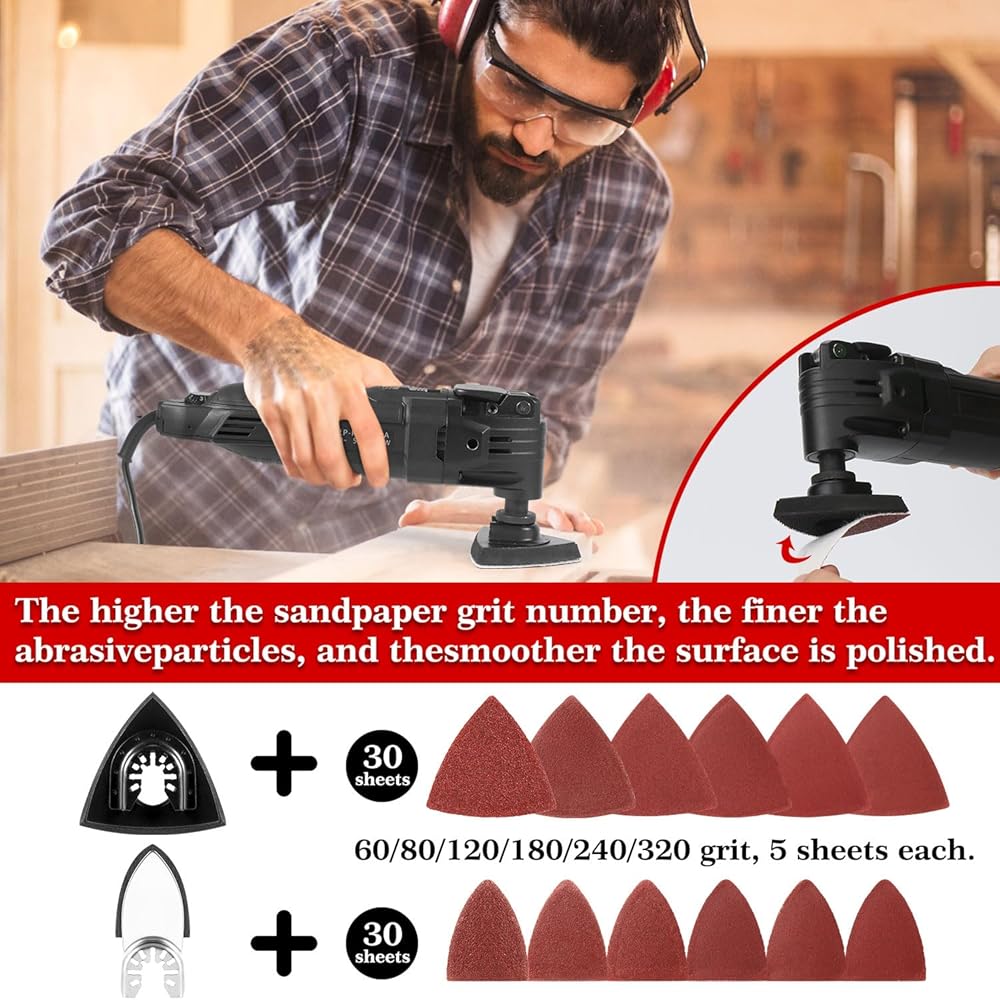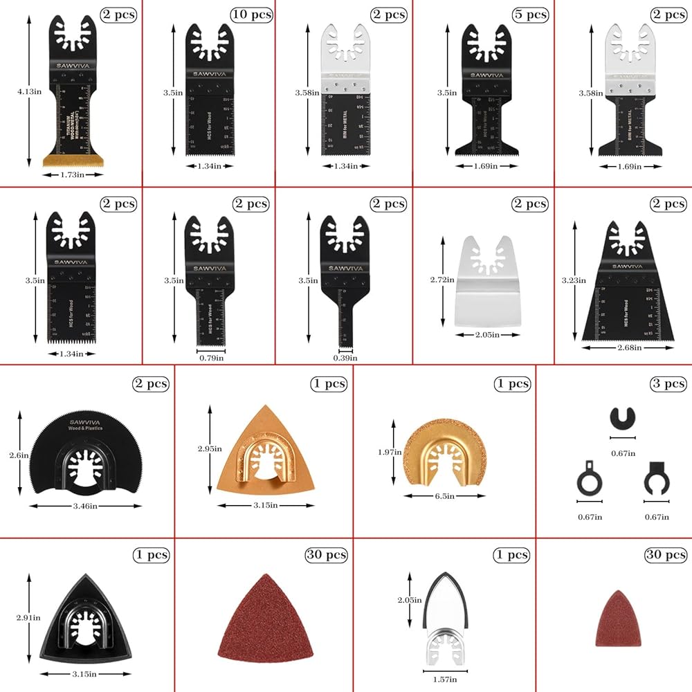 SAWVIVA 100 Pack Multi Tool Blades Kits: A totally cost-effective tool set including 13 kinds of different blades, 3pcs adapters, and 60pcs sandpapers. It can help you solve a variety of home repair or renovation work, perfect for wood/plastic/plaster/metal cutting and polishing.
