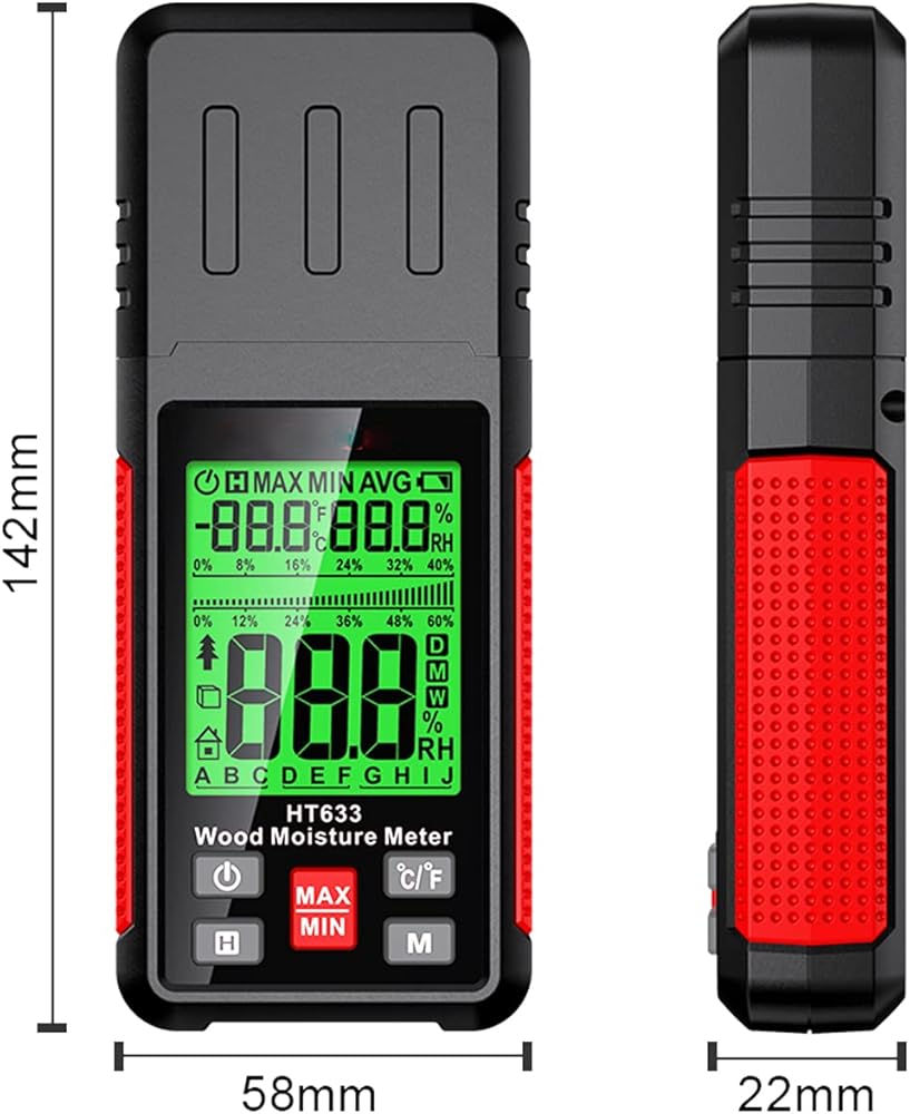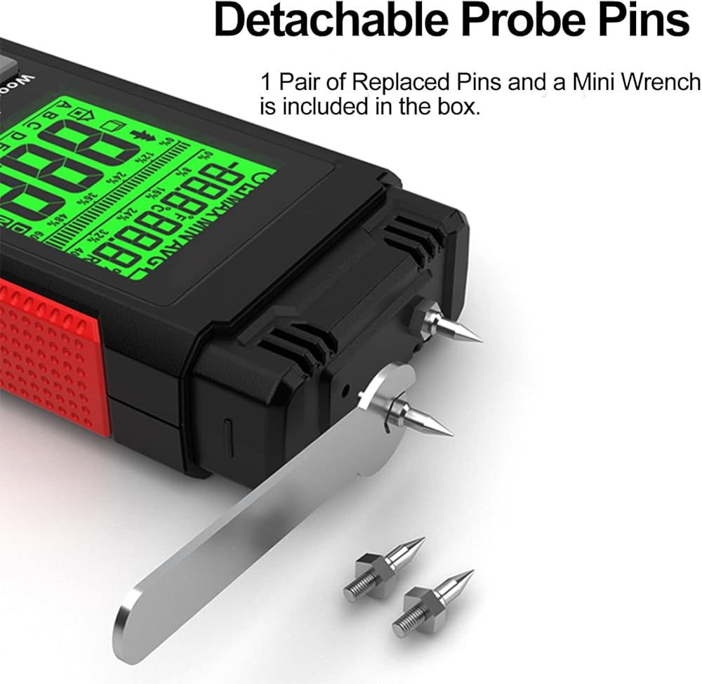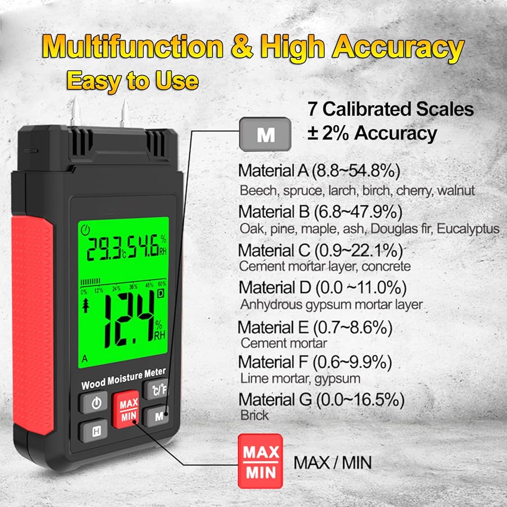 【Wide Application】It is perfect for wood, bamboo, firewood, logs, cardboard, paper. Can be used for Beech, Spruce, Larch, Birch, Cherry, Walnut, Oak, Pine, Maple, Ash, Douglas Fir, Eucalyptus, Cement Mortar Layer, Concrete, Anhydrous Gypsum Motar Layer, Cement Mortar, Lime Mortar, Gypsum, Brick. Easy to operate, just press button M to select appropriate material type and pierce the probes into the tested object. Made of high-quality ABS material, durable and wear-resistant, uneasy to break.