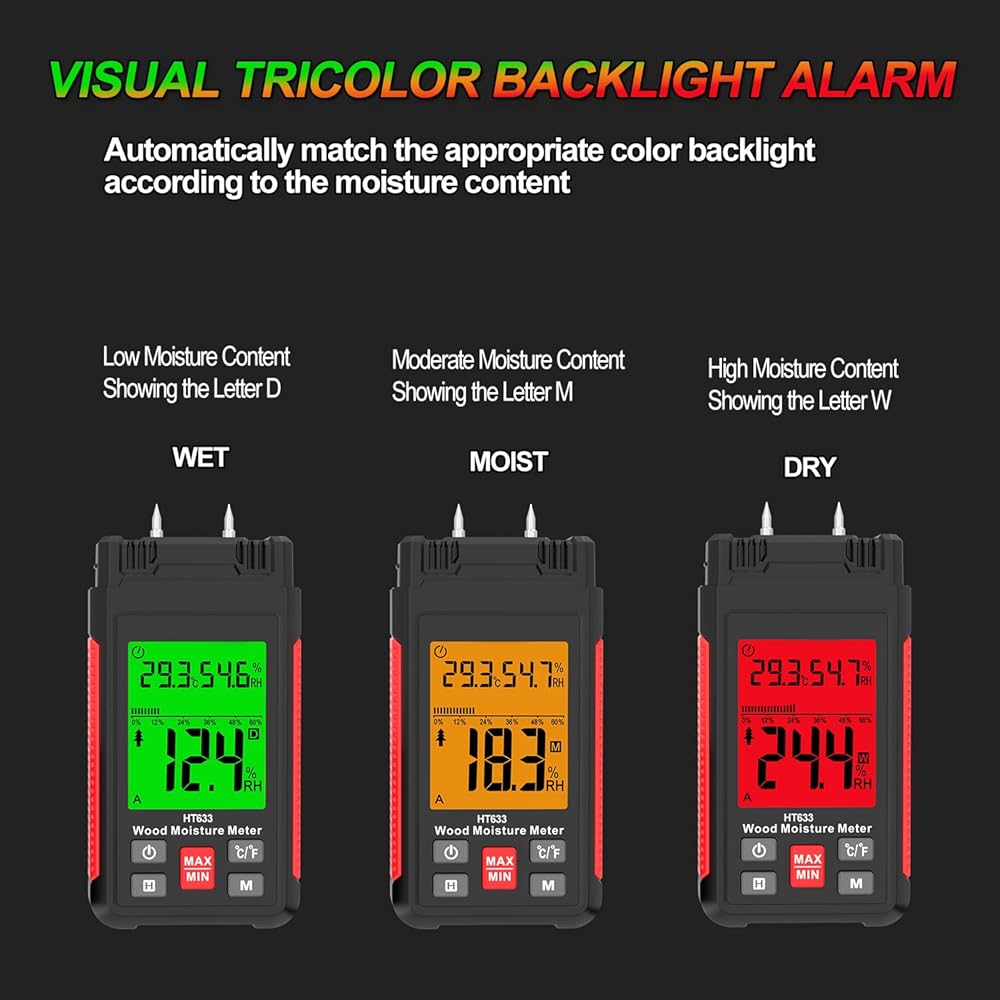 【3 in1 Wood Moisture Meter】This 3 in 1 wood moisture meter is designed to combine the functions of wood moisture meter, humidity meter and temperature meter, great for daily use. Designed with high-definition backlit LCD display and data hold function, gives extended visibility suited to any ambient brightness. A reliable must-have tool for home owners, woodworkers, painters & architects to detect moisture level and spot hidden damage. A carry bag is provided for storage.