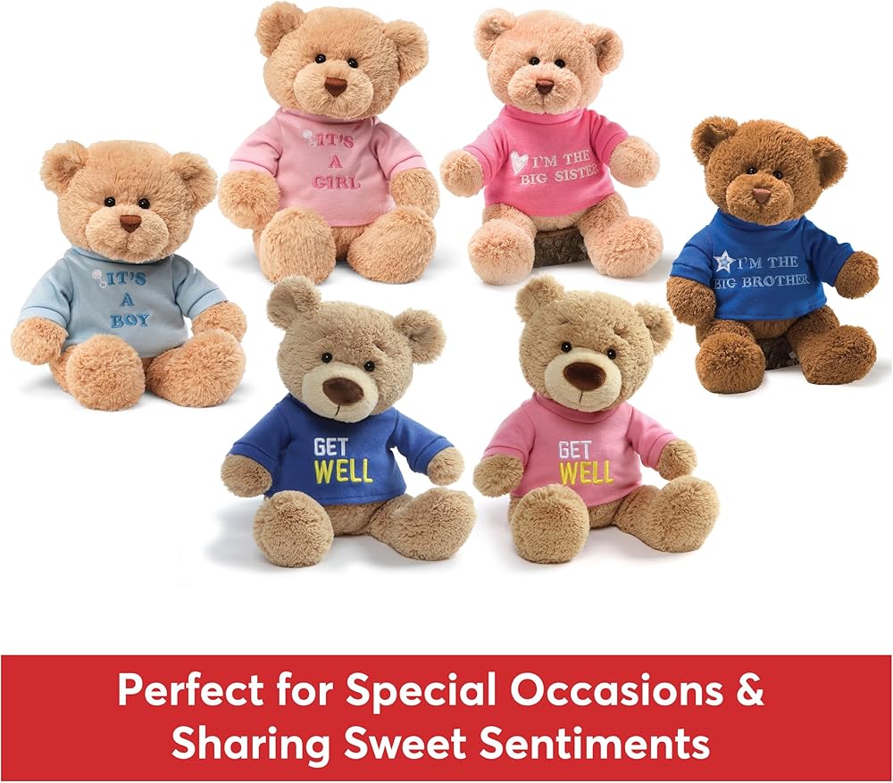 Say it loud with a GUND message bear! These cuddly, super-soft teddy bears capture classic designs with special messages printed on vibrant t-shirts, helping share sweet sentiments and celebrate occasions with anyone. Whether it's to wish them luck, welcome a new bundle of joy to the world, or just show someone you care, the GUND message bears are the perfect way to say it with a hug and a smile. These adorable 12-inch brown teddy bears feature outstretched open arms, happy smiles, and embroidered features that make them perfect for all ages. Each bear wears a vibrant t-shirt with a message, featuring fun and encouraging phrases such as, “I Love You,” “Feel Better,” “I'm the Big Brother,” and “It's a Girl”. Make anyone's day special with a cuddly GUND bear! Like all of our teddy bears, GUND message bears are surface-washable and appropriate for ages 1 and up. Do not machine-wash or use harsh chemical cleaners. Explore our entire collection of t-shirt message bears, including new styles made from 100% recycled materials!