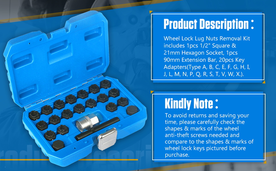 [تتضمن العبوة]: مجموعة إزالة مفاتيح أقفال العجلات 22 قطعة تتضمن قطعة واحدة مقاس 1/2 بوصة مربعة ومقبس سداسي 21 مم، قطعة واحدة شريط تمديد 90 مم، 20 قطعة محولات مفاتيح (النوع A، B، C، E، F، G، H، I، J ، L، M، N، P، Q، R، S، T، V، W، X).
