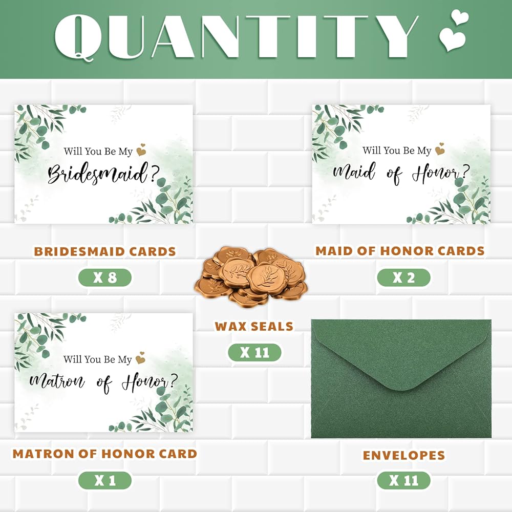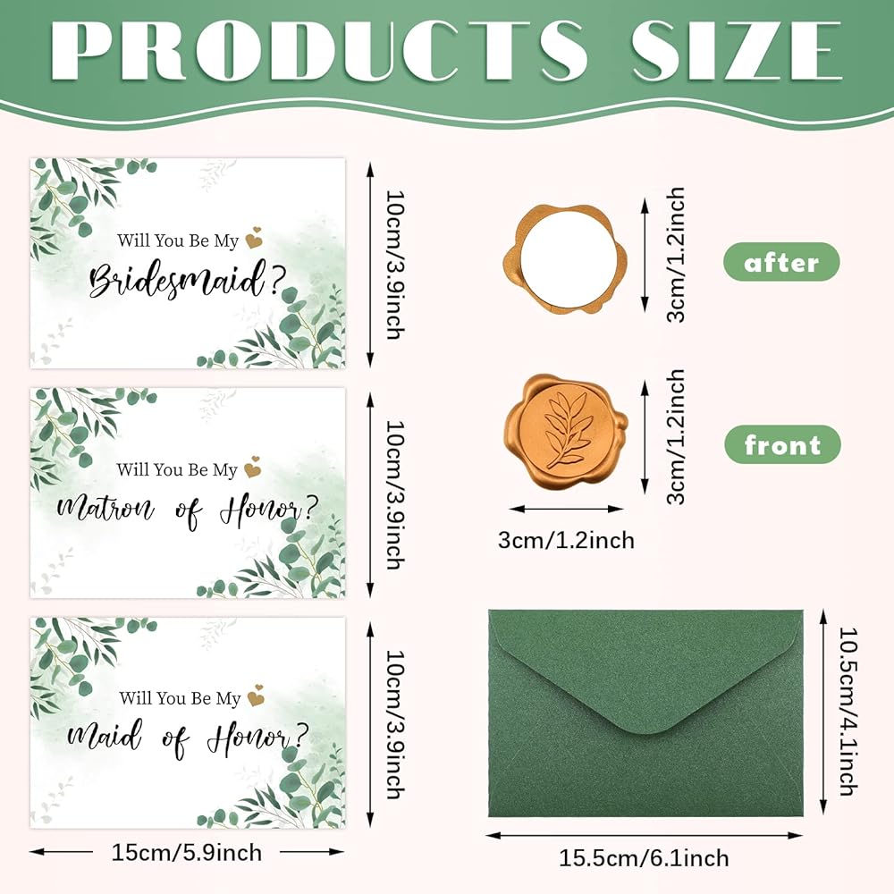 What You Will Receive: you will receive 11 pieces of bridesmaid cards in 3 designs, 11 pieces of envelopes, 11 pieces of wax stickers; Enough quantity to meet your needs and sharing needs
