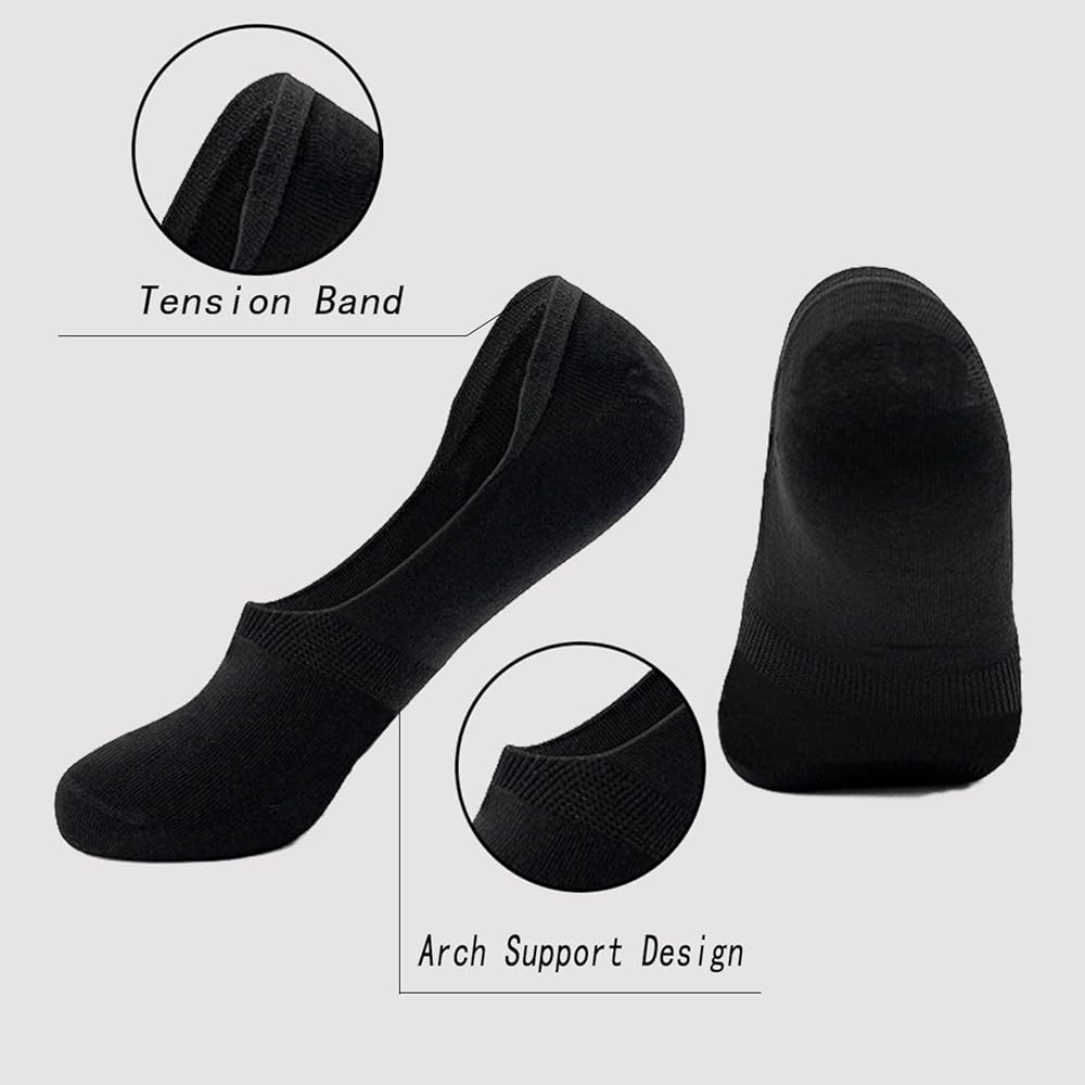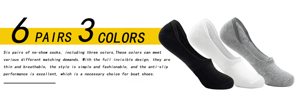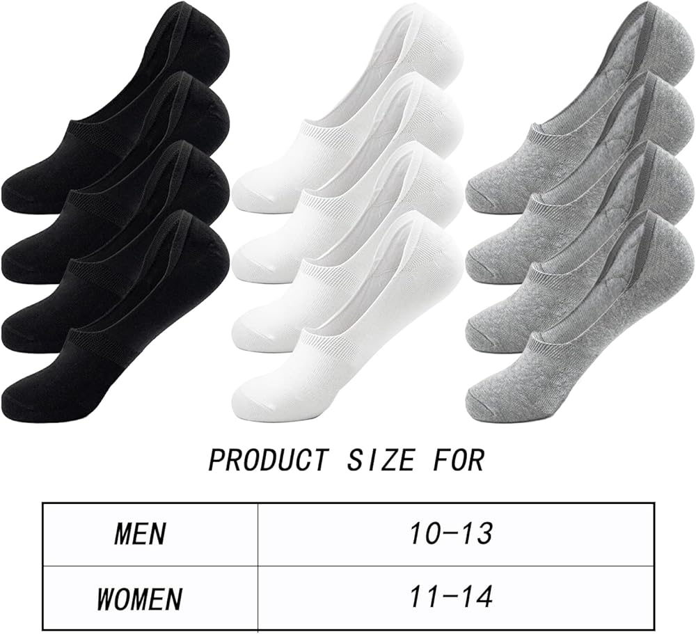 Product Introduction: Six pairs of no-show socks are neatly arranged inside the box, encompassing three colors: the classic black, the refreshing white, and the stable grey. These colors can fulfill diverse matching demands. The men's sizes 10-13 and women's sizes11-14, indicating extensive adaptability.