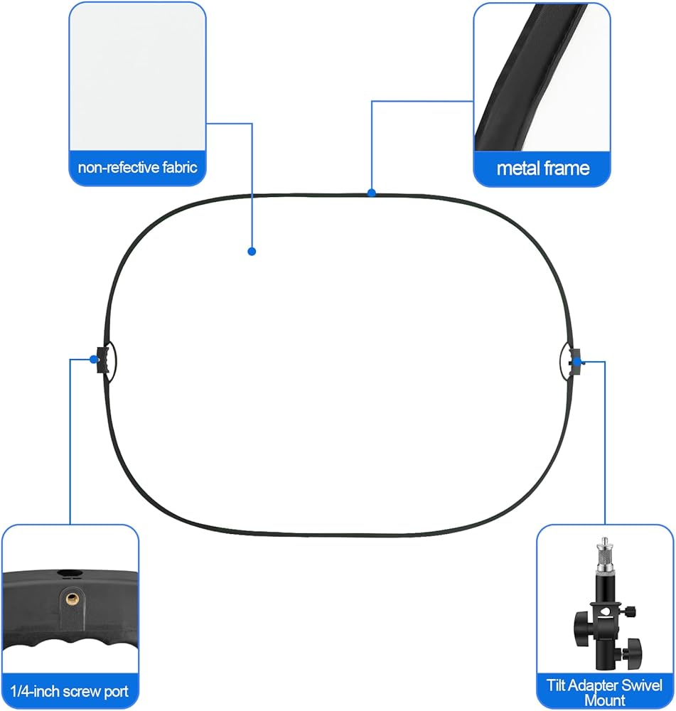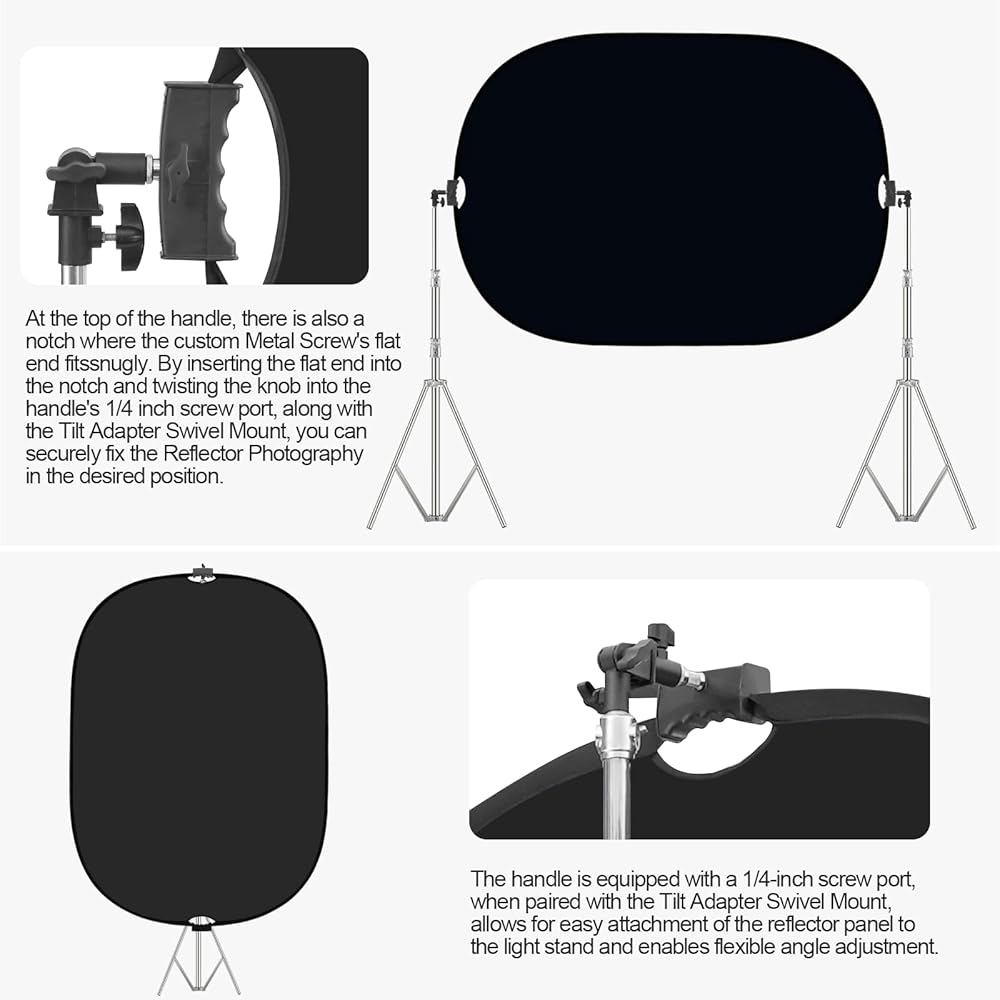 【EASY TO USE】The handle design of this reflector board is ergonomically crafted with a comfortable curved shape, ensuring a secure and comfortable grip. The handle is equipped with a 1/4-inch screw port, allowing easy attachment of the reflector panel to a light stand with the Tilt Adapter Swivel Mount for flexible angle adjustment. It also features a notch at the top for snug fitting of the custom Metal Screw's flat end, securing the reflector in place when twisted into the handle's screw port along with the Tilt Adapter Swivel Mount.