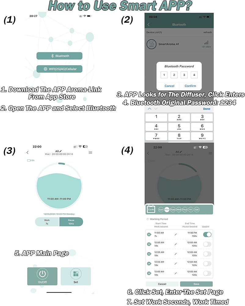 【BLUETOOTH SMART APP CONTROL】The waterless aromatherapy diffuser is very easy to control for every customer. Download the app AROMA-LINK, use the bluetooth to connect with your fragrance machine, setting the working time. It will more easy to know how to use it than the regular diffuser with buttons. If you do not know how to use the app, please contact us.