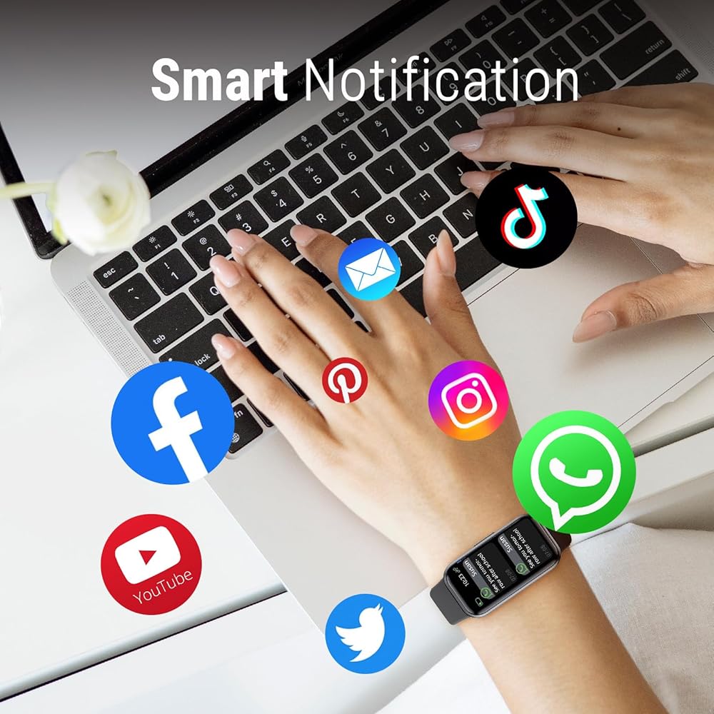 Heart Rate and SpO2 Monitoring: With built-in heart rate monitoring, the Fitness Tracker provides real-time heart rate data, enabling you to optimize your workouts and track your cardiovascular health. It also offers SpO2 tracking to measure your blood oxygen levels, providing valuable insights into your overall well-being.