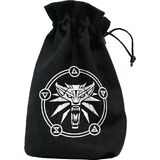 With swords and magic. This dice pouch, inspired by The Witcher franchise, depicts the well-known School of the Wolf symbol, placed among a circle of witcher signs. Made of sturdy black cotton with a white print, the bag is straightforward and effective just like the master witcher himself. Closed with durable strings, it can hold 5 full sets of dice.