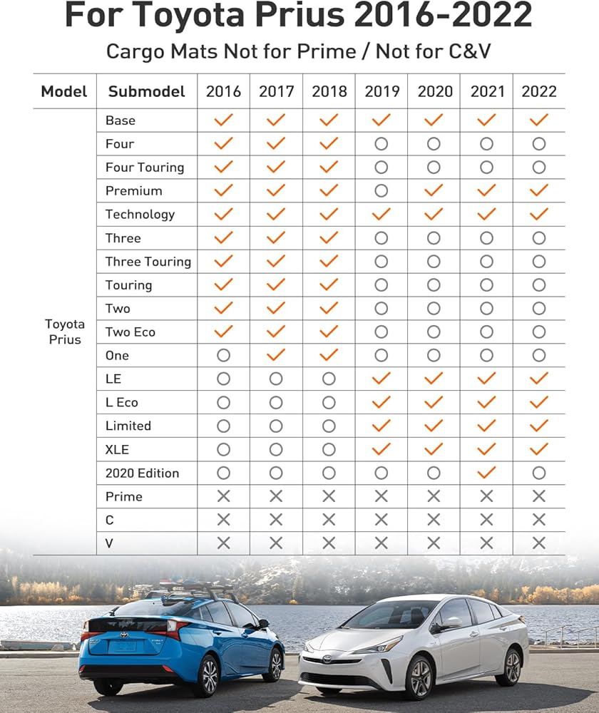 【Perfect Custom Fit】Accessories for Toyota prius floor mats trunk mat custom designed for Toyota Prius 2016 2017 2018 2019 2020 2021 2022 (Not fit for Toyota Prius C&V). Floor mats and cargo liner are perfect fit for prius 2016-2022. Floor Mats fit for Prius Prime, but the cargo liner doesn't fit for prius prime. Edge to edge fit maximize protection for your car carpet and make your car more high end than before.