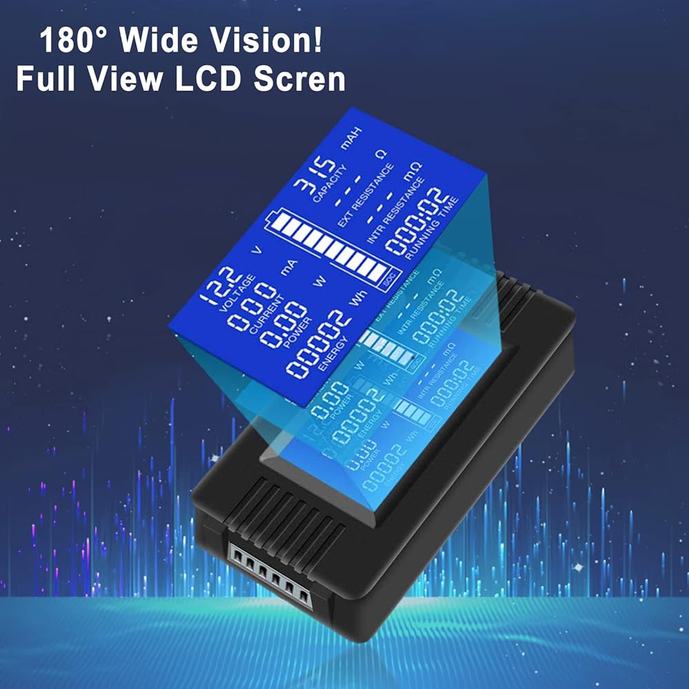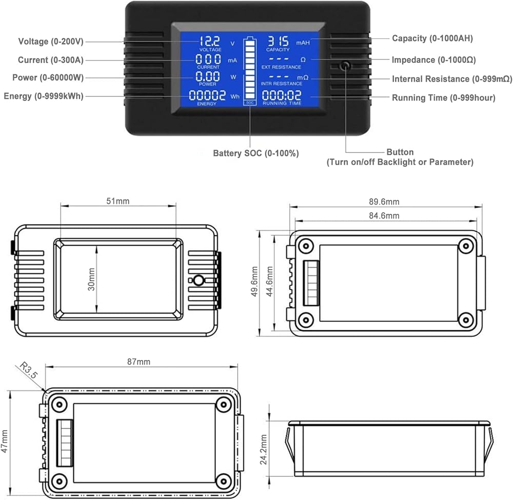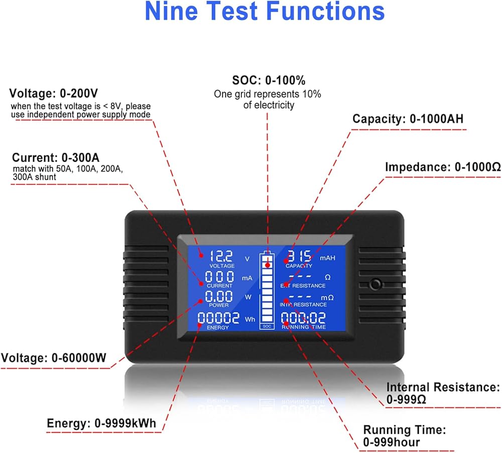 【9-in-1 Multifunctional Meter】This DC battery monitor can be used to test the battery voltage, discharge current, discharge power, discharge impedance, internal resistance, capacity, energy consumption, SOC and running time. FCC and CE certification passed.