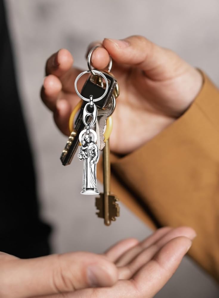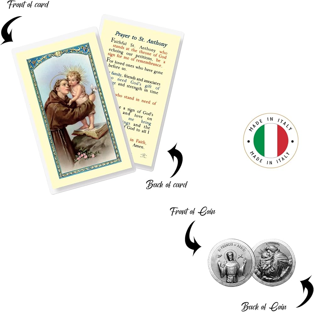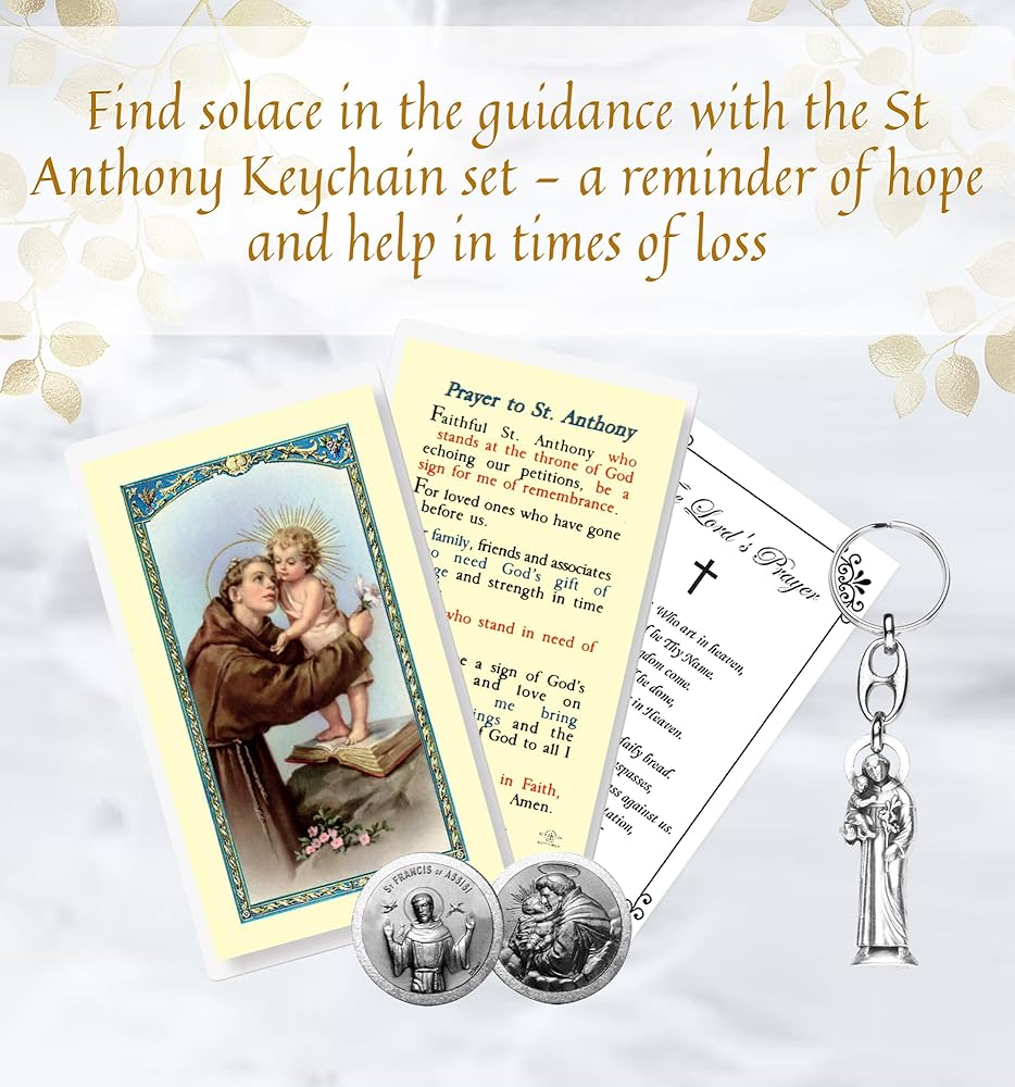Explore a comprehensive and deeply meaningful collection that offers essential tools to elevate the faith journey. Within this set, find a St. Anthony key chain that you can carry with you every day. As you hold it, it becomes a symbol of unwavering faith and a constant reminder of the protection that St. Anthony offers, especially in times of need. The included St Anthony prayer card is designed to be your spiritual guide, providing direction and solace in your prayers. Together with the St Anthony pocket coin, keep them close to your heart, and may it aid you in seeking divine intercession, whether it's for finding lost items or for guidance in your daily life. The St Anthony of Padua keychain is more than a simple accessory; it's a cherished connection to the divine that you can attach to your most personal belongings. Whether it's your keys, a backpack, or a handbag, this keychain serves as a constant reminder of St. Anthony's mediation. Carry it together with the St Anthony laminated prayer card and let them represent direction and courage in your daily life. The St. Anthony medal key chain takes your belief to another level. With the medal adorning your keychain, think of the presence of this beloved saint accompanying you throughout your day and offer your deepest prayer to the reverent saint with the help of the St Anthony holy card. Whether you choose to keep this set for yourself or to gift it to loved ones who share your deep devotion to St. Anthony, it equips you with the necessary tools to deepen your faith and navigate life's challenges with grace. Saint Anthony Key Chain Size: 2", 2 Sided Pocket Coin Size: 1.13", Saint Anthony Holy Card Size: 2.5" x 4.5".