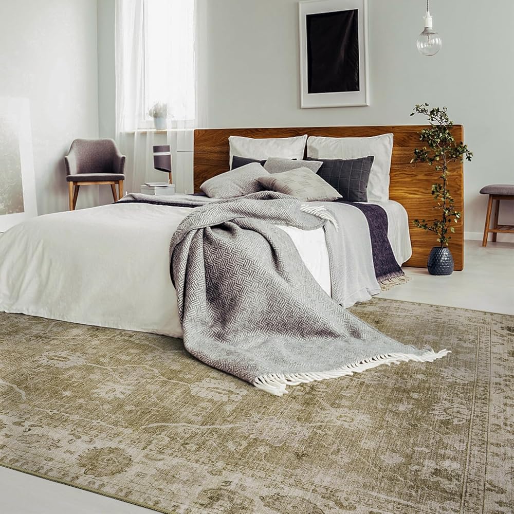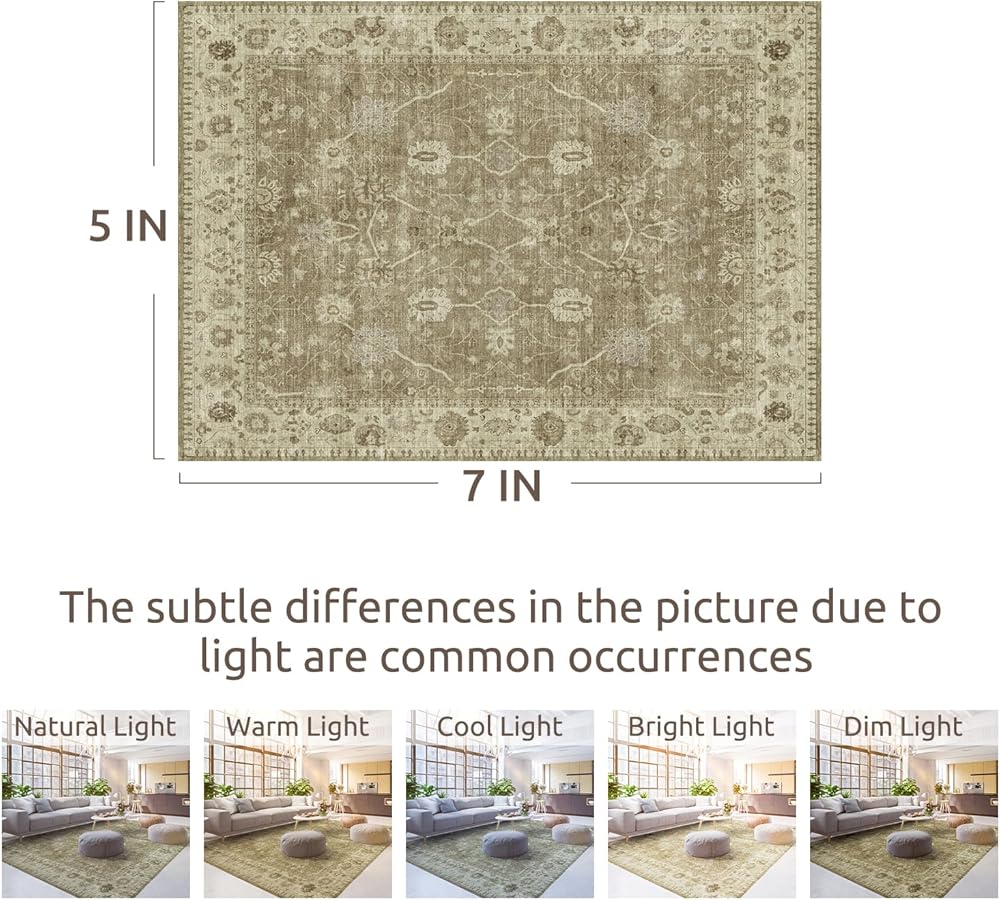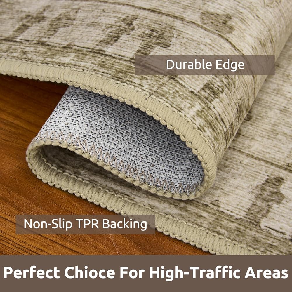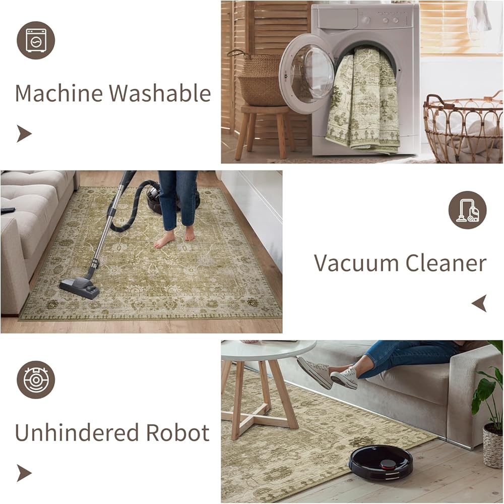 【Easy Care& Machine Washable】Our 5x7 washable rugs are machine washable with cold water and no bleach.You can also use a vacuum cleaner, broom, wipe, or water hose for daily maintenance,especially suiting for pet families.Some creases of the distressed area rug may be at the beginning, but simply walking on the low pile carpet or ironing it flat on the floor will make the creases disappear within a few days.