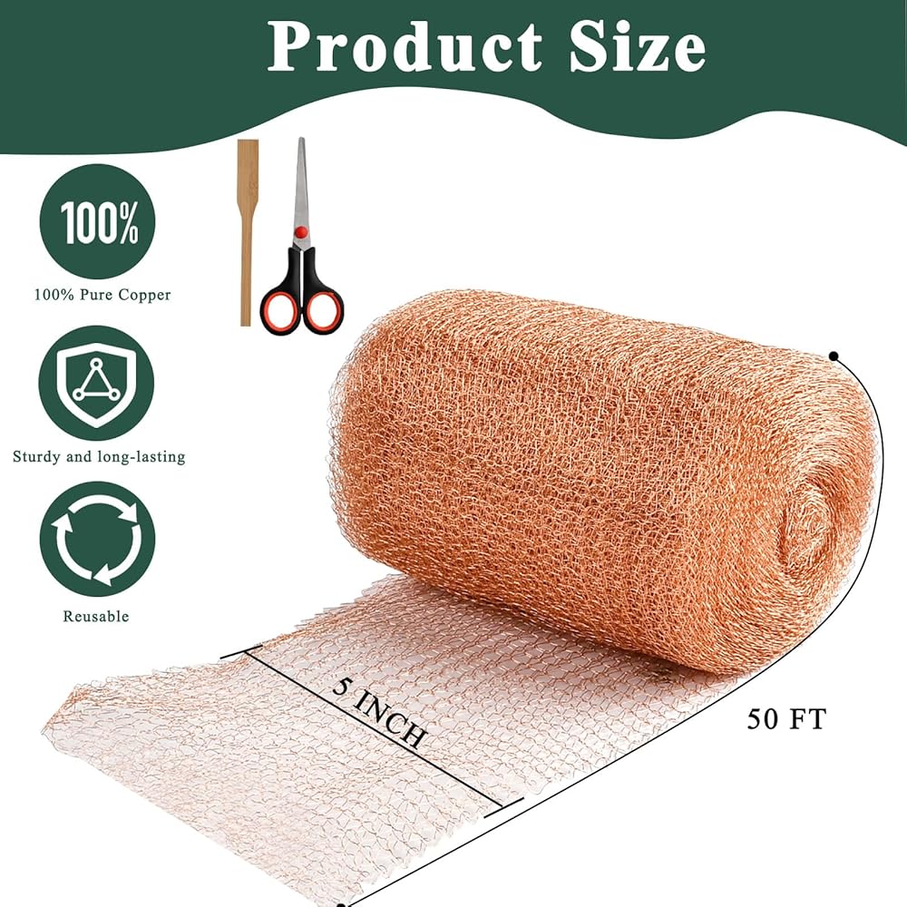 Copper Mesh, 5" x 50 ft Copper Mesh Roll for Rodent Control, 100% Pure Copper Wire Mesh Screen with 1 Scissor for Plants, Mice & Rodent Defense, Snail Control, Holes Block
