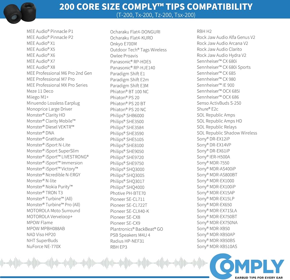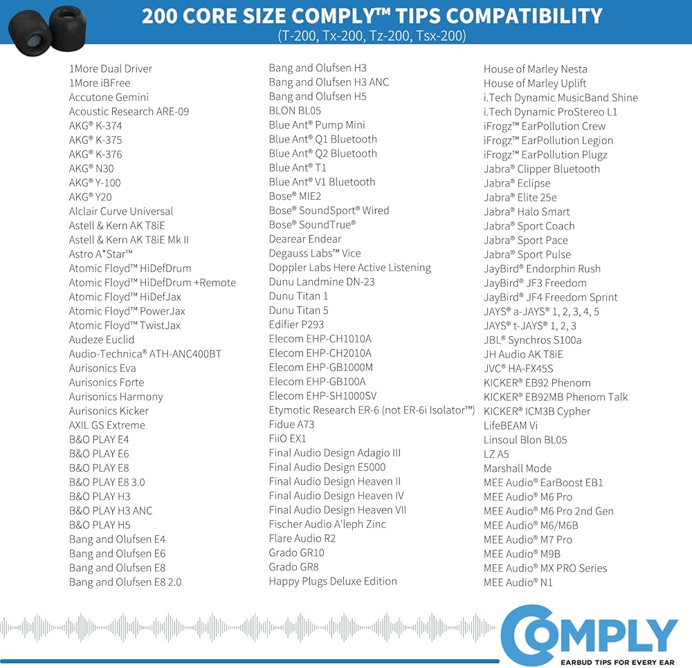 COMPATIBILITY: Bang and Olufsen, Sennheiser, Axil, MEE Audio, KZ, Bose, BLON, Final, Ultimate Ears, CCA, 1More, Ulitmate Ears and more! Always check compatibility before purchasing (see compatibility image or search ‘find tips for your device' at the Comply Foam website). This will ensure the tips for your earbuds will not only fit on your device, but will also work if you have a charging case.