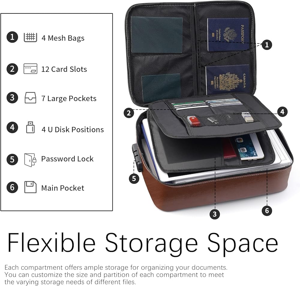 Fireproof Document Bag with Lock, Important Document Organizer,Home Office Travel Safe Bag, 3 Layer Portable Filing Storage for Waterproof File Passport,Certificates,Legal Documents, Brown