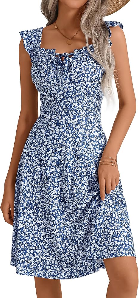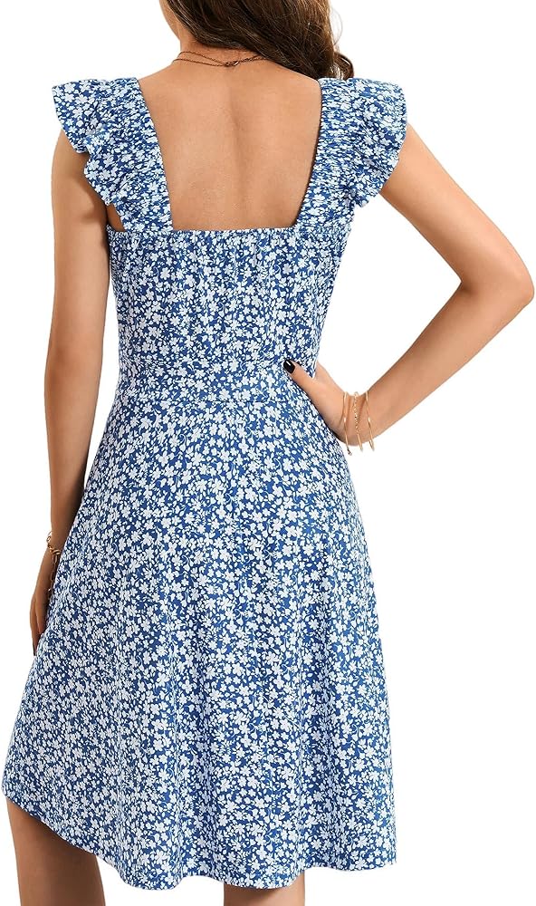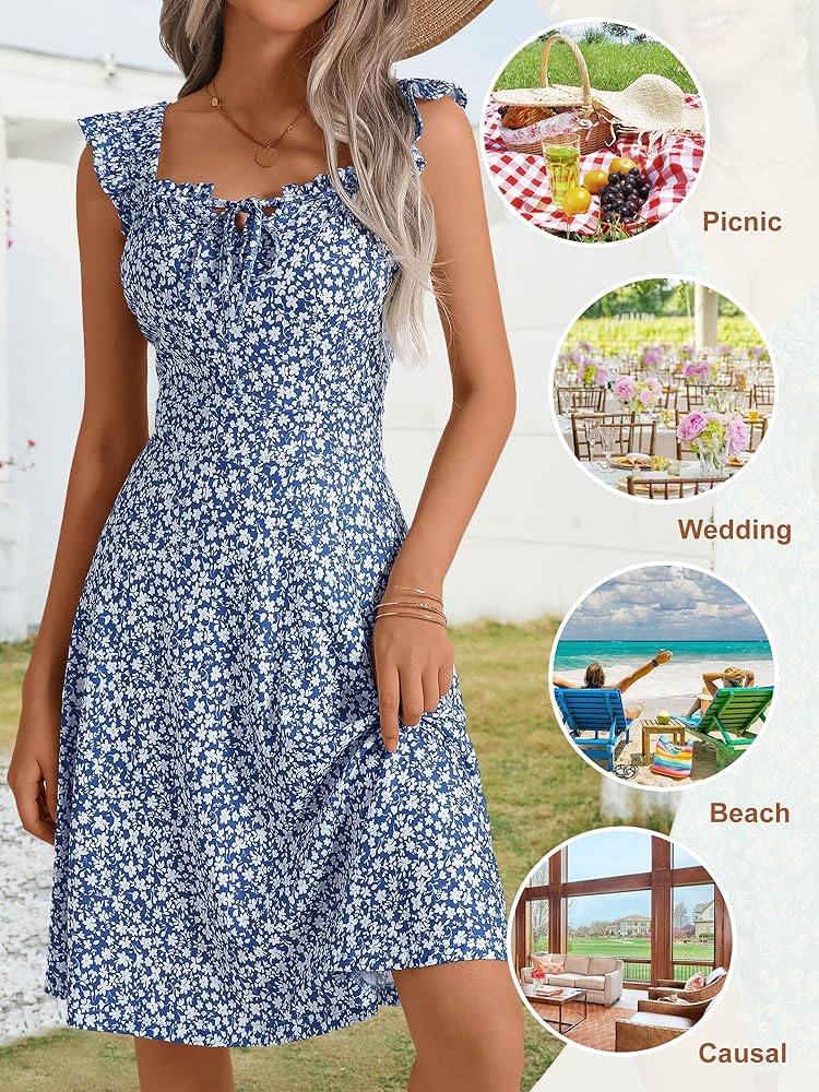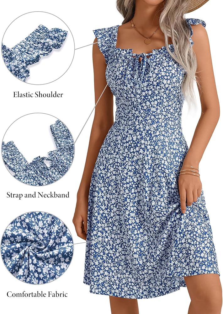 【Stylish Design】This casual comfort summer sundresses features a square neck, ruffle cap sleeve, elastic bands on shoulders, adjustable neckline strap, waist line, A-line, floral print, and knee-length.