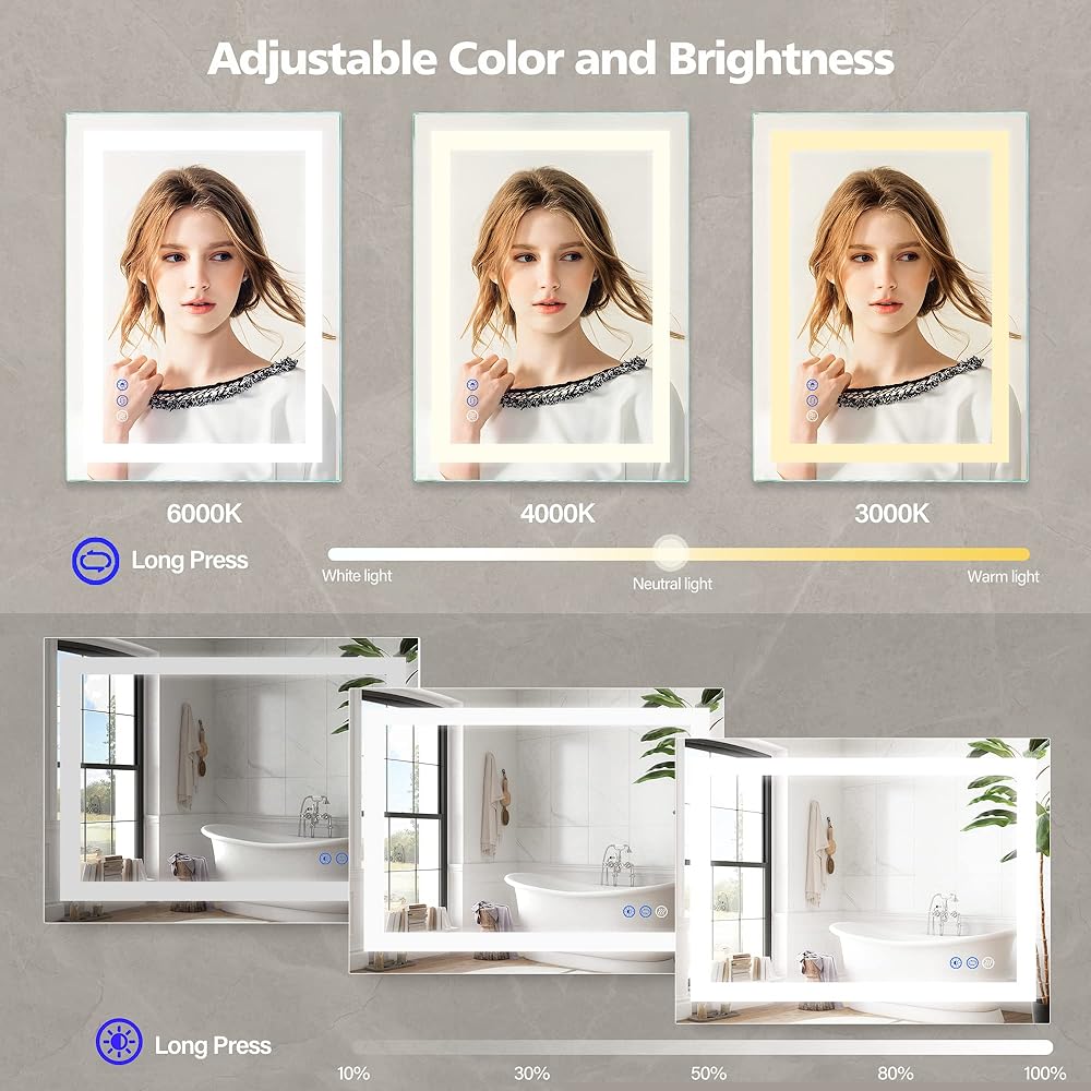 Dimmable LED Mirror - Tailor your bathroom lighting to perfection with our dimmable LED bathroom mirror. Easily adjust brightness from 1-100% and fine-tune color temperature (3000K - 6000K) using a convenient touch button. Whether it's for makeup application or shaving, meet all your lighting needs effortlessly. Plus, enjoy the added benefit of automatic power-off within an hour, promoting energy conservation.