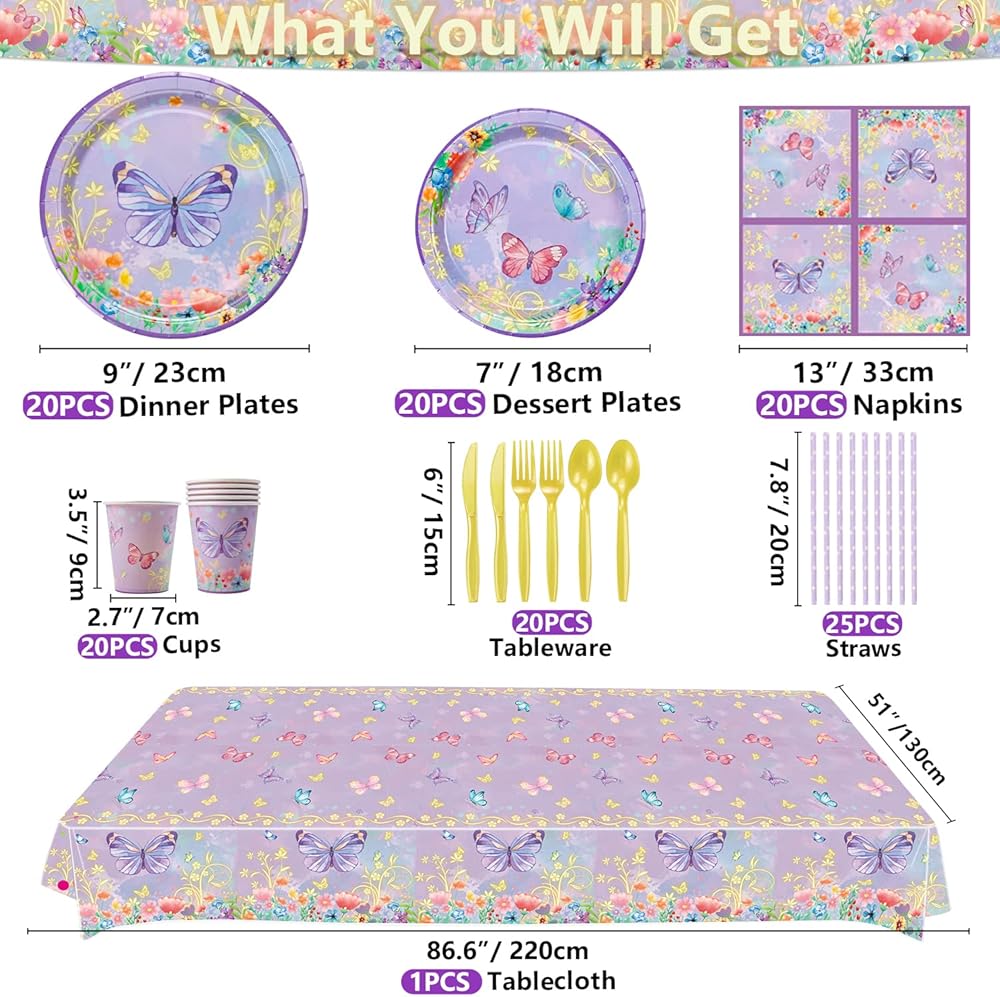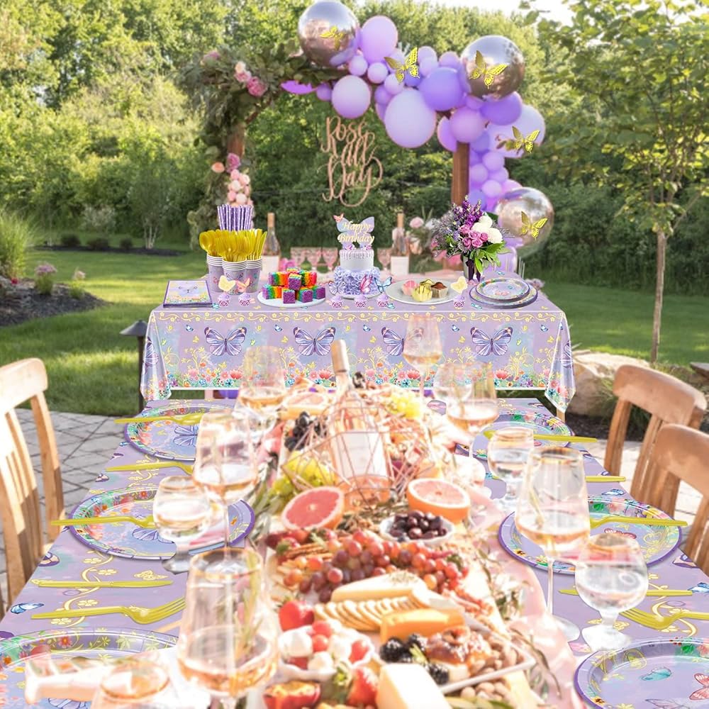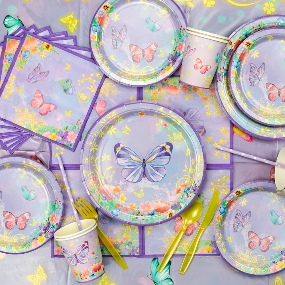 High Quality - Grade paper for butterfly party supplies tableware set, which is environmentally friendly, non-toxic, and not folded or torn, so you don't have to worry about breaking and dropping your food. Quality thick plastic material for tablecloths, knives, forks, and spoons, lightweight and portable, waterproof, and durable.