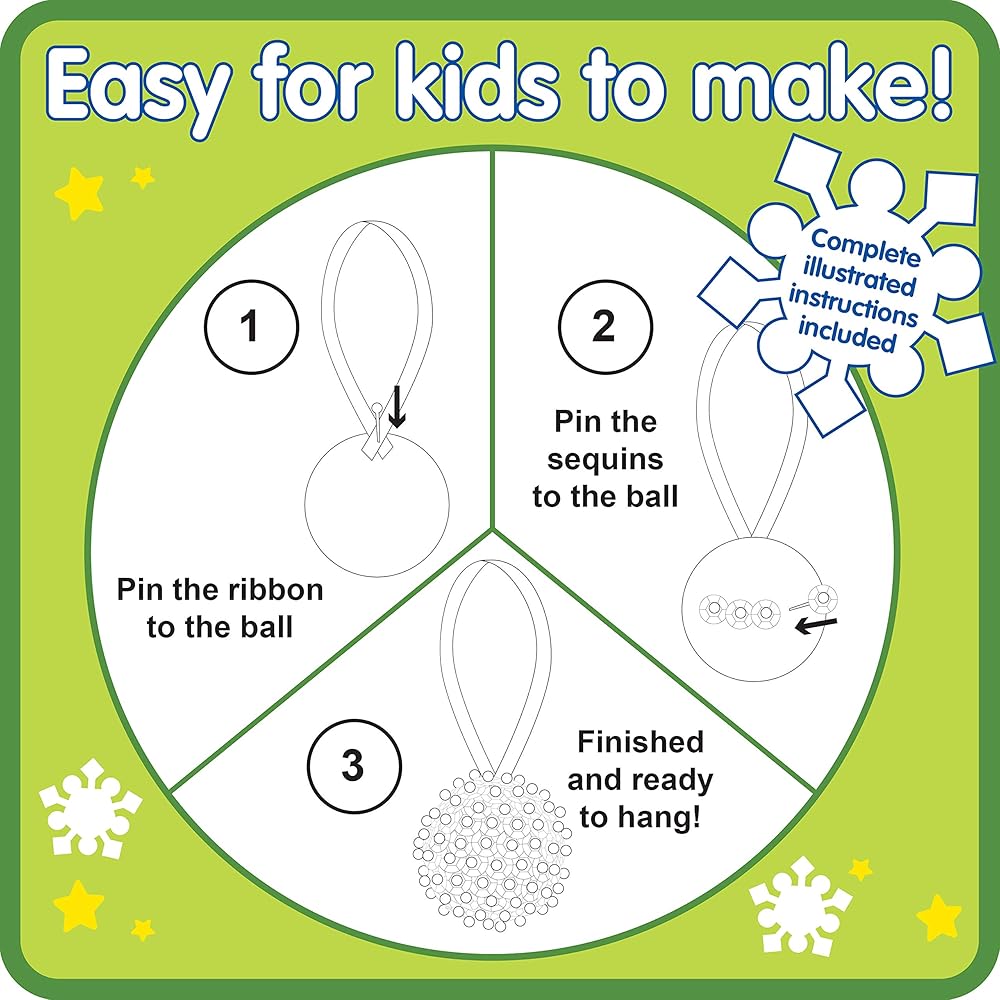 COMPLETE CRAFT KIT - This DIY Christmas tree decorations kit includes everything you need: 6 polystyrene foam balls, ribbons, coloured sequins (red, green, silver, gold), plastic pins and illustrated instructions