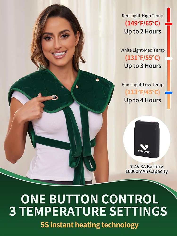5S INSTANT HEATING TECHNOLOGY: Vofuoti battery operated heating pad with a 7.4V 5000mAh battery to easily switch between 3 heat settings, allowing you to enjoy effective heat therapy at different temperatures, that runs for up to about 4 hours on Low setting, 3 hours on Medium, and 2 hours on High. (You can get an extra battery from our store if you need more heating. ASIN: B09CPXFTCP)