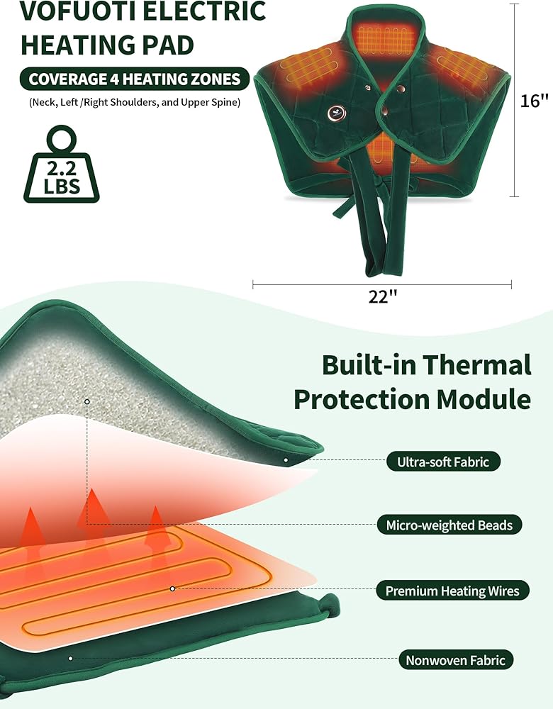 2.2LBS WEIGHTED DESIGN AND SNUG FIT: The neck and shoulder heating pads have slightly weighted edges and are filled with micro-glass beads for a better fit around your neck and shoulders. Do not worry about the heat pad slipping or falling off because it is secured with 2 snaps and 2 straps, ensuring fit and reducing heat loss.