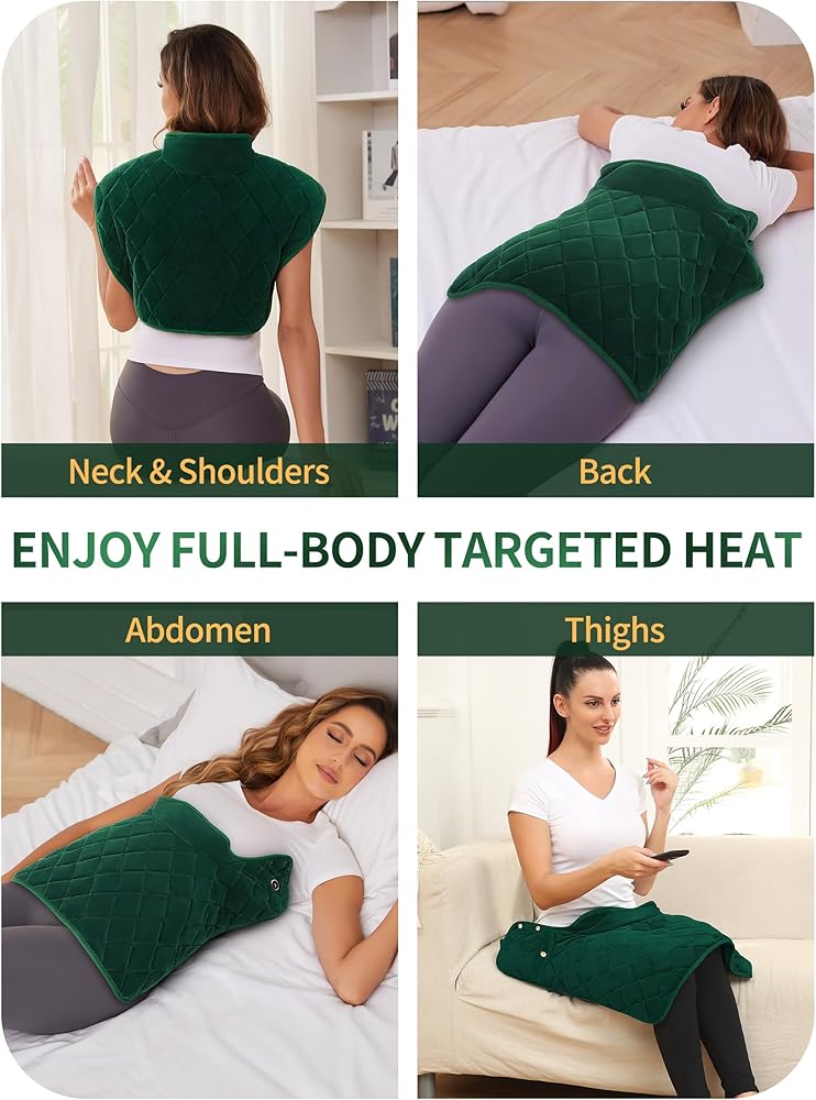 COVERAGE 4 HEATING ZONES: Electric heating pad is in a large size:16'' x 22'', and 4 heated zones that cover the neck, left and right shoulders, and upper spine; battery heating pad heats up quickly heat up to increases blood circulation; it effectively soothes muscle tension, spasms, and soreness. The heating pad can be used on various body parts, including the legs, shoulders, back, waist, and belly.