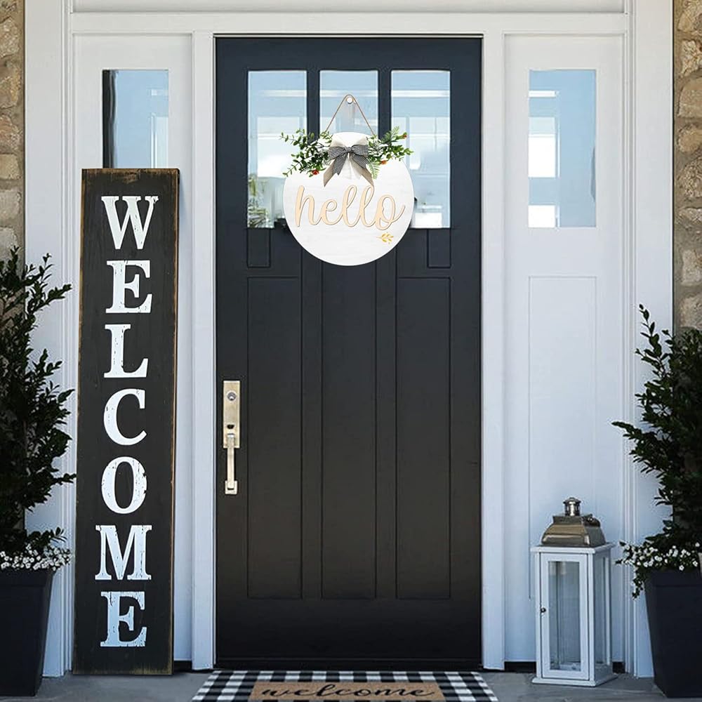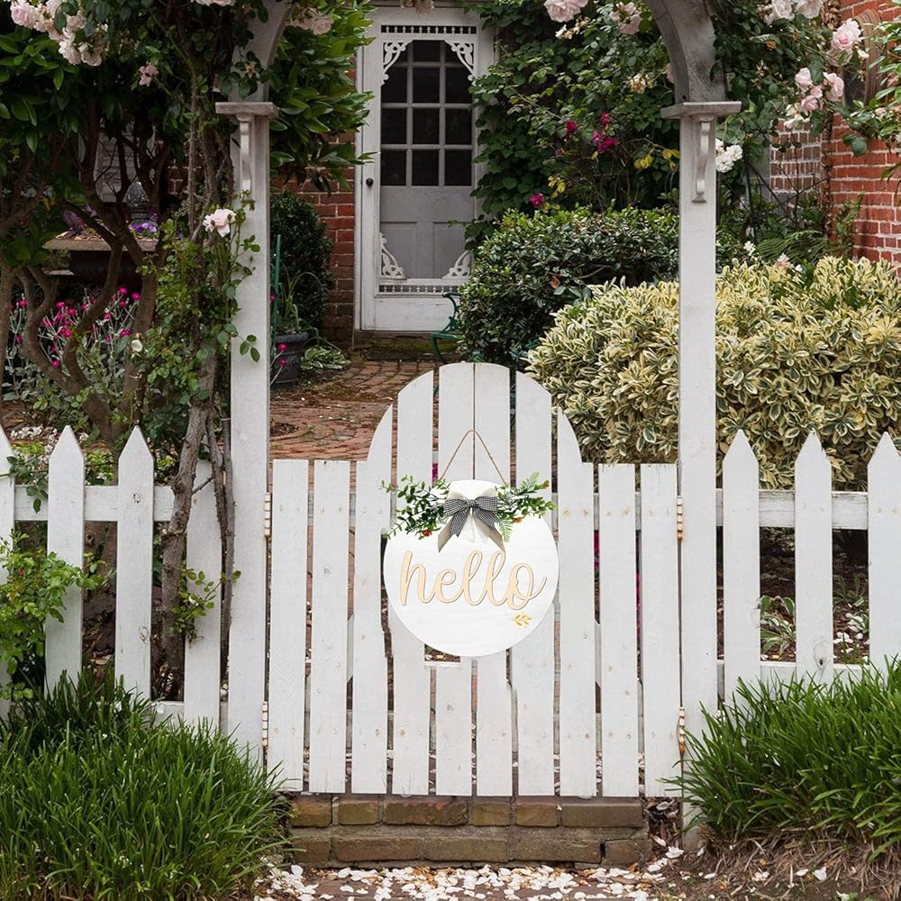 Hello Front Door Decorative Wooden Round Hello Wreath Sign With Delicate Bow for Farmhouse, Porch Door Window Wall Wooden Hanging Sign Rustic Outdoor Interior Decoration, 12 X 12 Inches