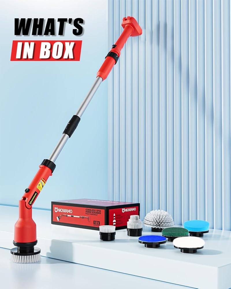 Uniqwamo Electric Spin Scrubber Compatible for Milwaukee 18V Battery(Battery NOT Included), 1000 RPM Battery Powered Scrubber with Adjustable Extension Arm & 8 Brushes & Gloves for Tub/Tile/Floor
