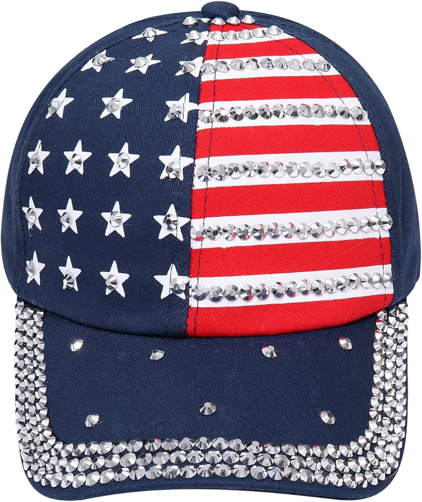 Adjustable Ball Cap:This fun red white blue patrotic baseball hat made of polyester+rhinestone. It is great for a day in sun with pre-curved visor for UV protection. This is your everyday cap for all occasions such as fishing, running, dancing, tennis and camping.Adjustable back strap to fit all heads just right and opening for a pony-tail!! Light weight, breathable and comfortable. Finished with an adjustable strapback with metal buckle closure. One size fits most.