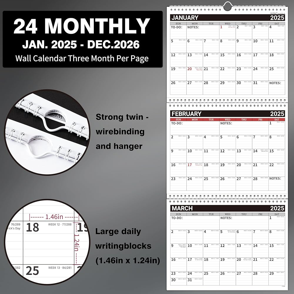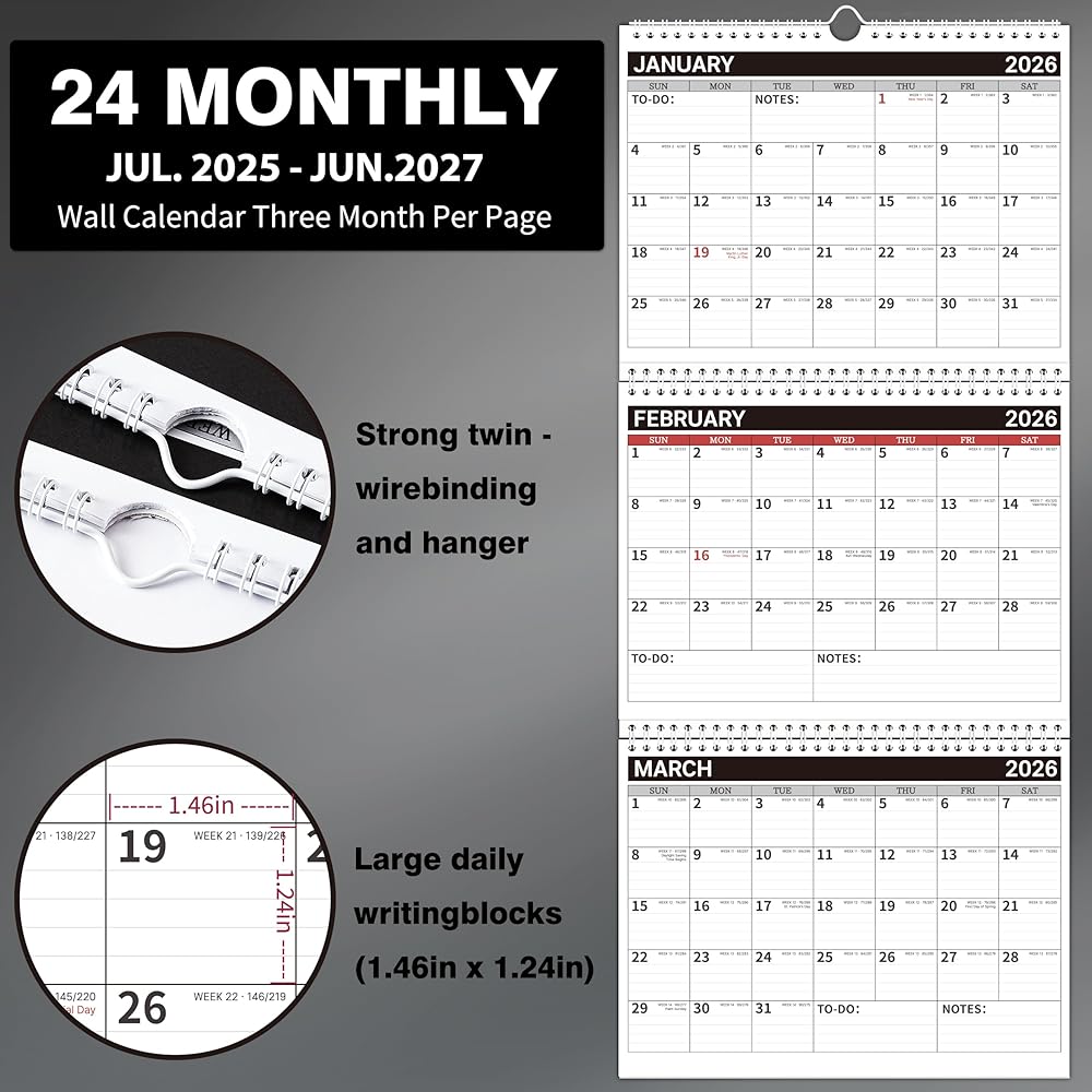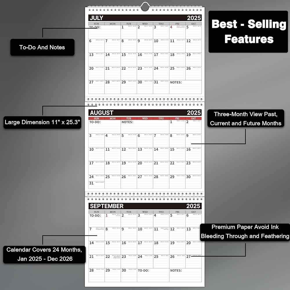 📆 FUNCTIONAL DETAILS - This vertical hanging 2024-2025 calendar is 11 inches wide and opens to 26 inches with its three months fully open. Each daily block is 1.38" x 1.5". The paper used a high quality bleed proof type. The 3 month calendar can be nicely folded into A4 size notebook for carrying anywhere and you can tear the month for any convenience instead of turning page.