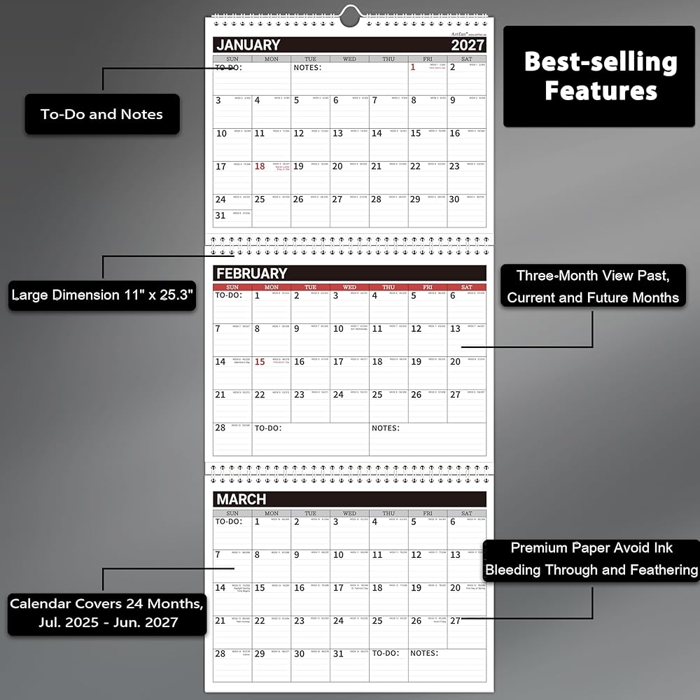Calendar 2026-2027 - 3 Month Wall Calendar Vertical Display (Folded in a Month), JAN 2026 - DEC 2027, 11" x 25.3"(Open), 2 Year Calendar, 2026 Calendar 24 Months - Black red