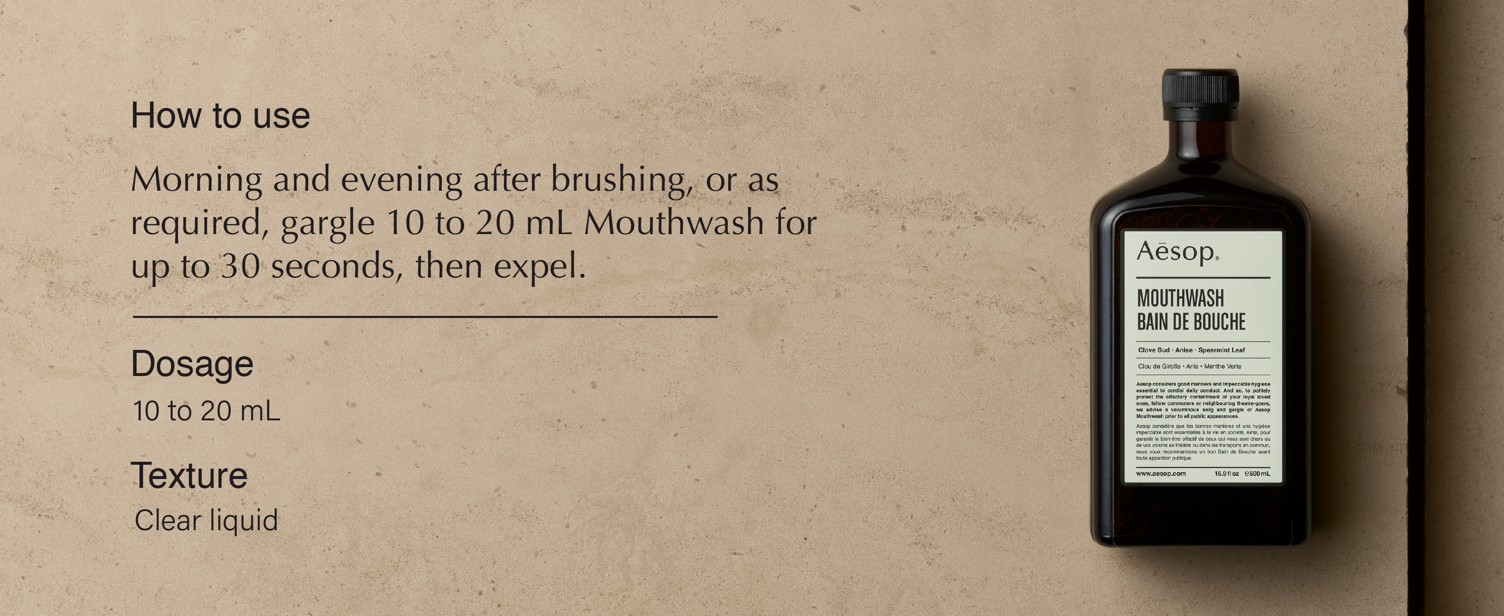 - How to Use: Morning and evening after brushing, or as required, gargle 10 to 20 mL Mouthwash for up to 30 seconds, then expel.